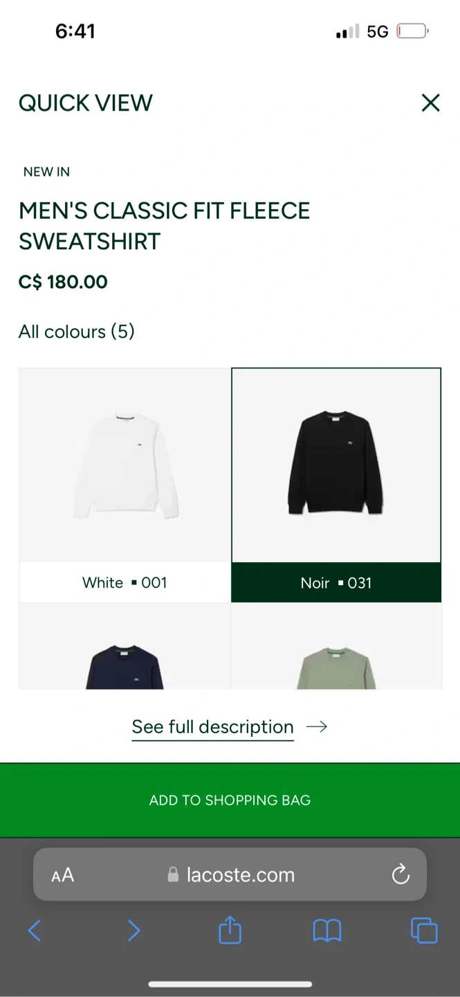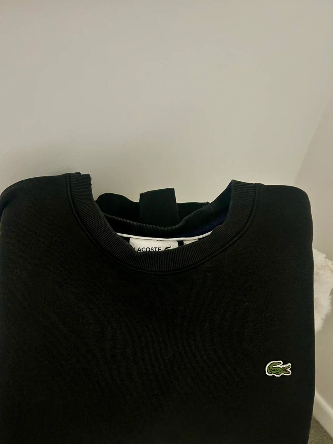 Selling a Lacoste classic fit fleece sweatshirt in black. It's a super comfy crew neck with the iconic croc emblem embroidered on the chest. Fleece cotton sweatshirt, front logo patch, crew neck, long sleeves with cuffs and dropped shoulders.
