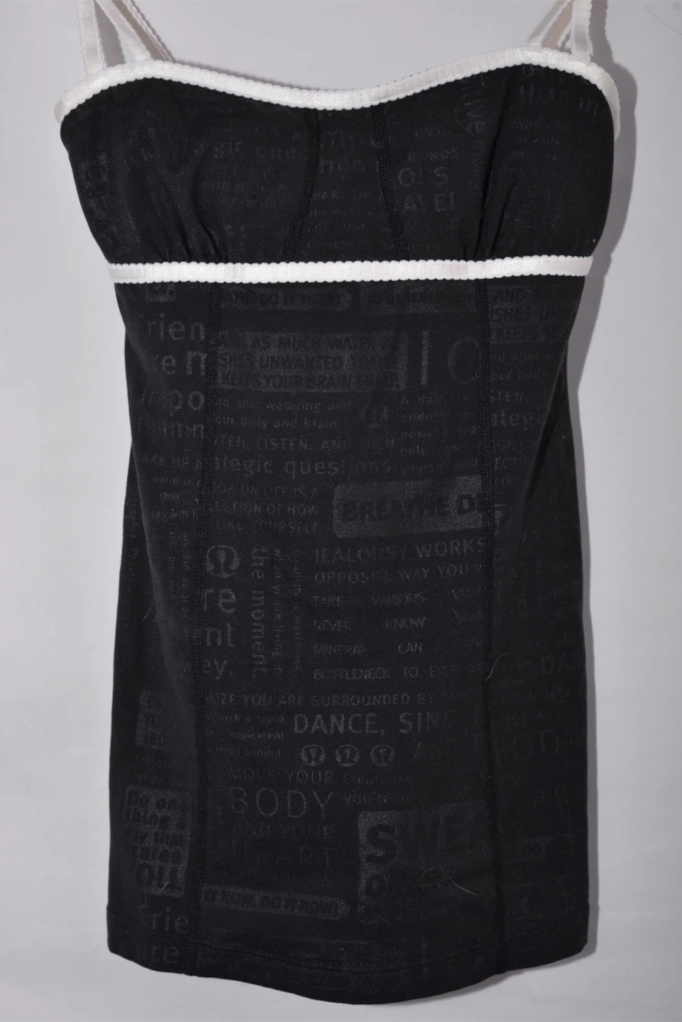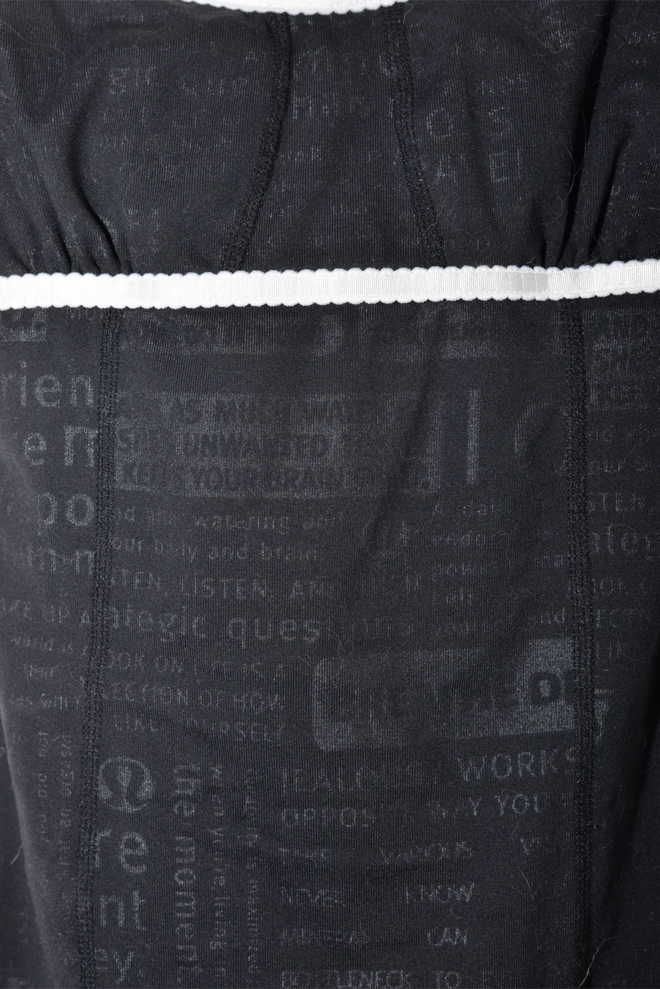 Selling a Lululemon tank top in black. The shirt has a white trim and text printed throughout the dress. Perfect for working out. Barely worn and in excellent condition.
