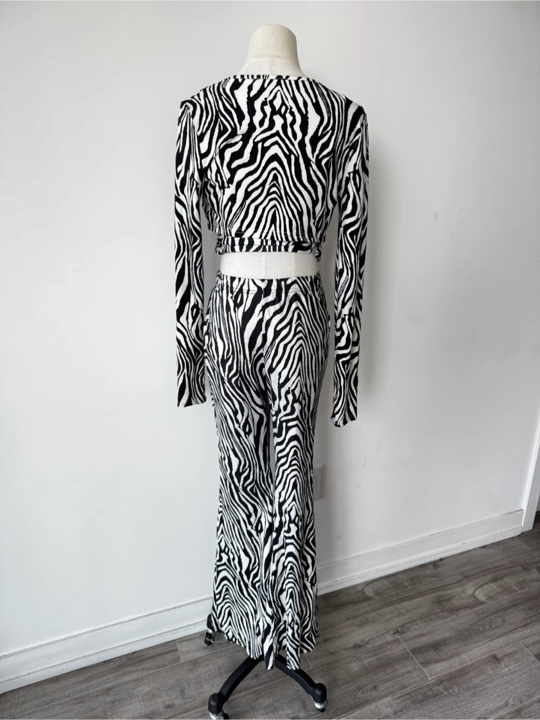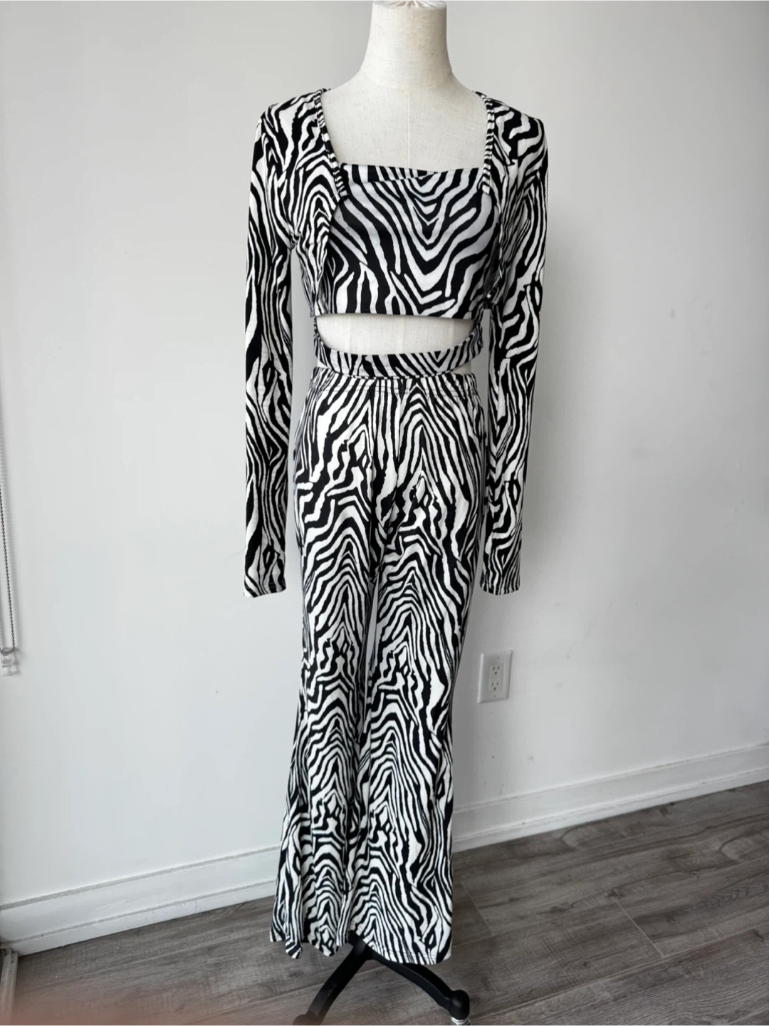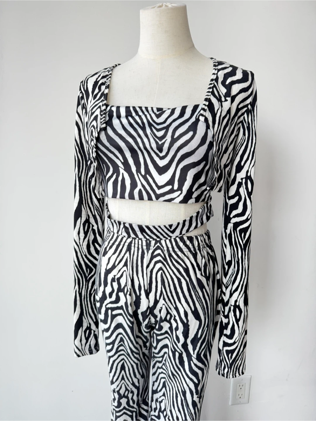 Check out this stylish three-piece set featuring a bold zebra print! It includes a cropped top, long-sleeved jacket, and flared pants. Perfect for making a statement!