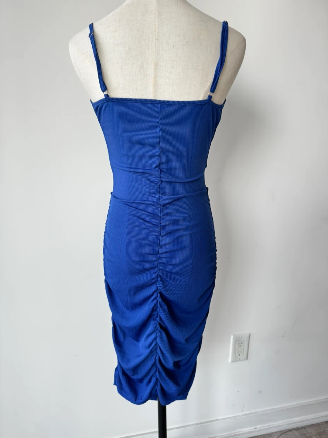 This is a cute blue mini dress with a unique cutout design! It's perfect for a night out or a special occasion. The dress features a flattering silhouette and is made from a comfortable, stretchy material.