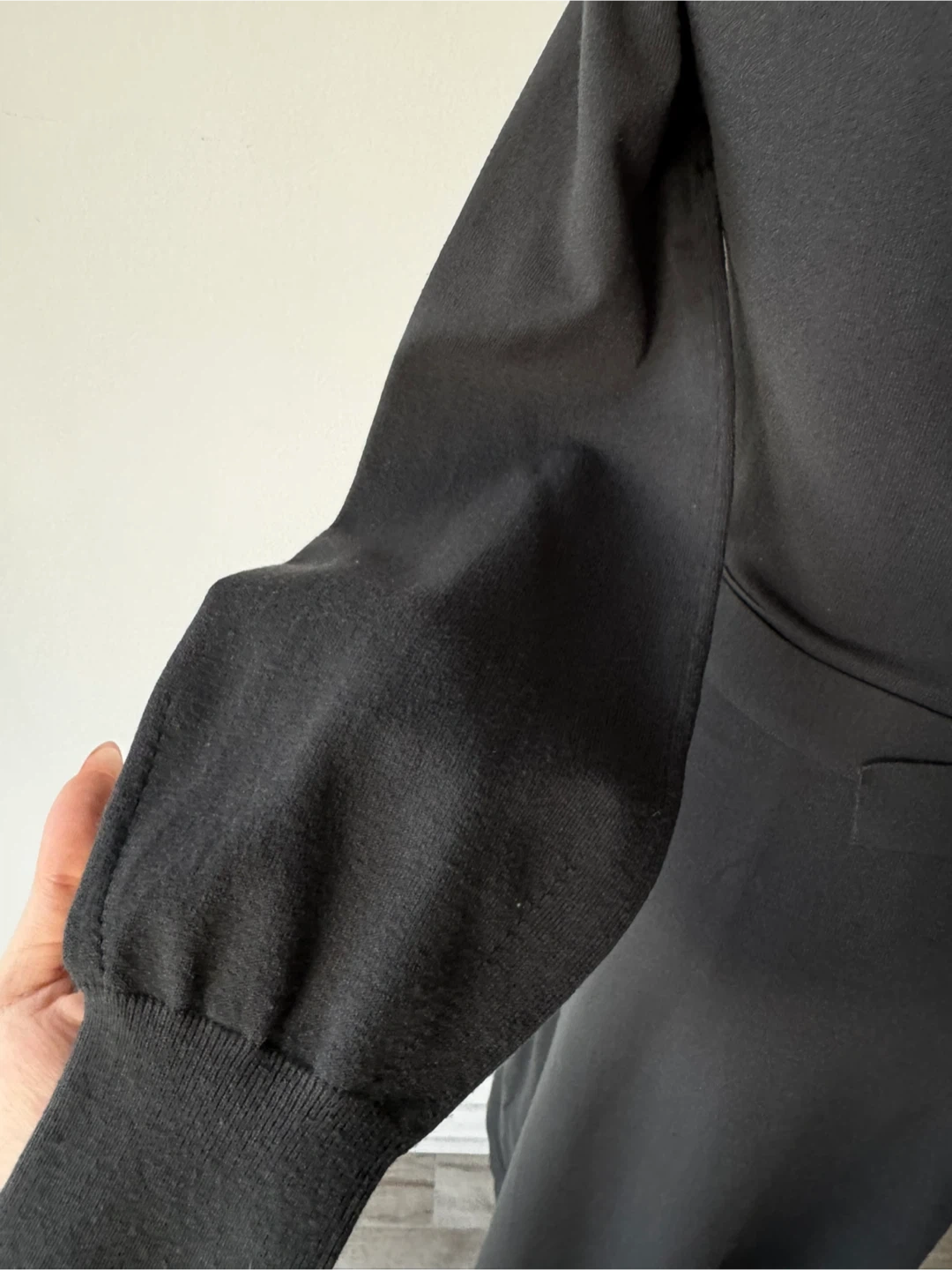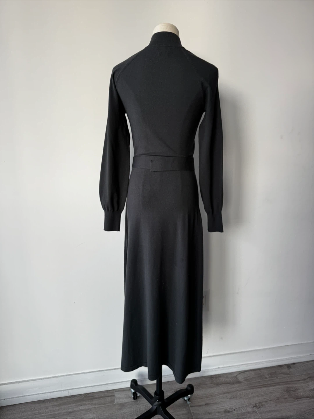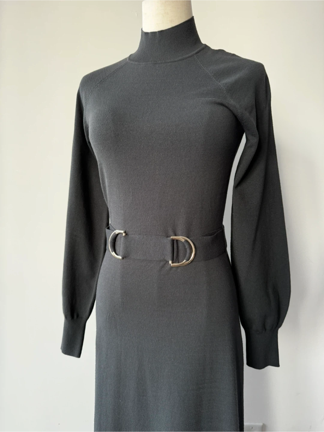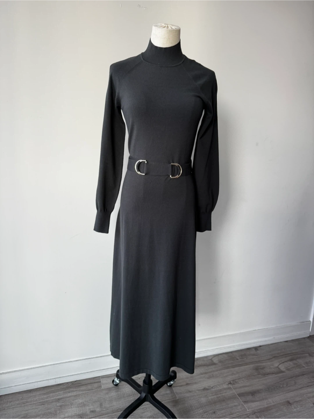 Selling a Massimo Dutti black knit dress in size S. It features a high neckline, long sleeves, and a belt with a silver-tone buckle. The dress is made in China and is in great condition!