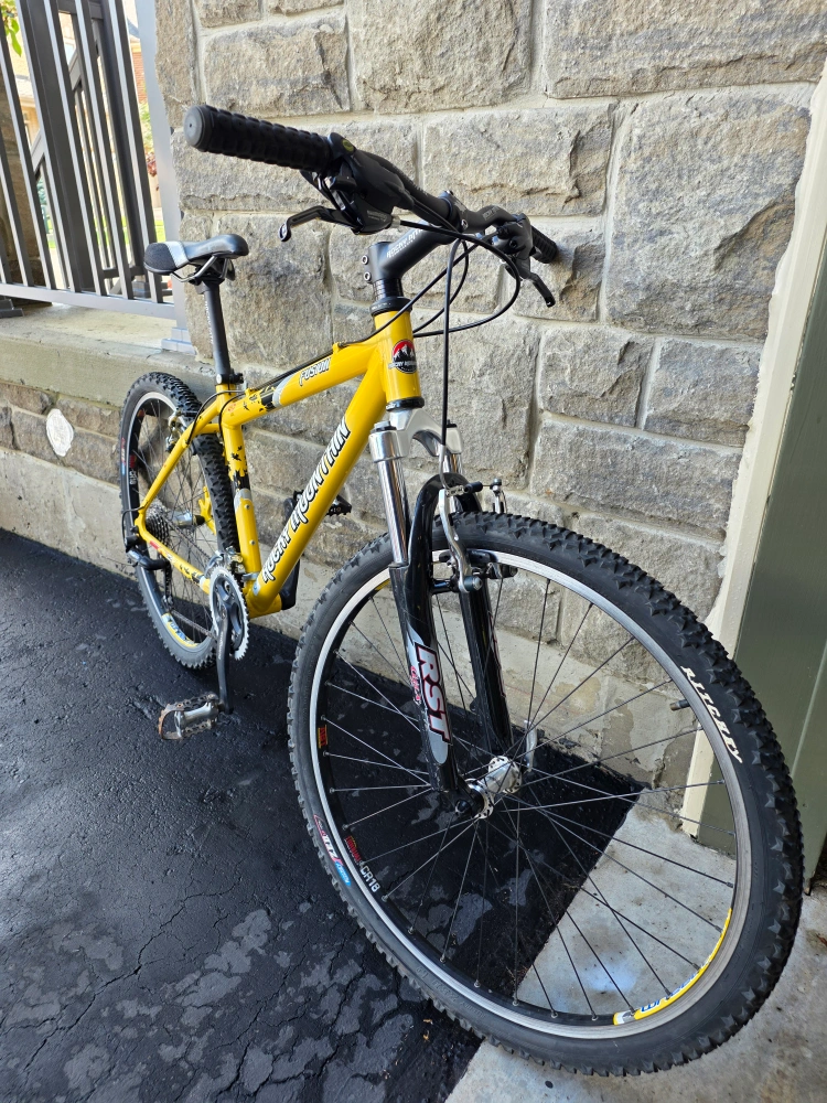 Selling a Rocky Mountain Fusion mountain bike in yellow. The frame size is 16 inches. It's in good condition and ready for some trails!