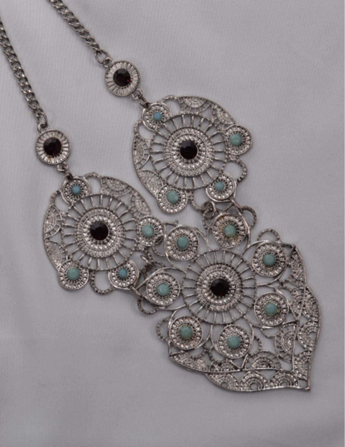 This is a beautiful silver-tone statement necklace. It features an intricate pattern with small coloured stones. Perfect for adding a touch of elegance or edge to any outfit!