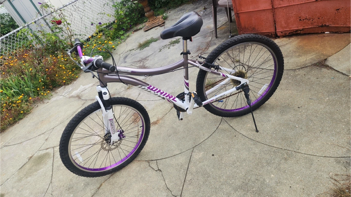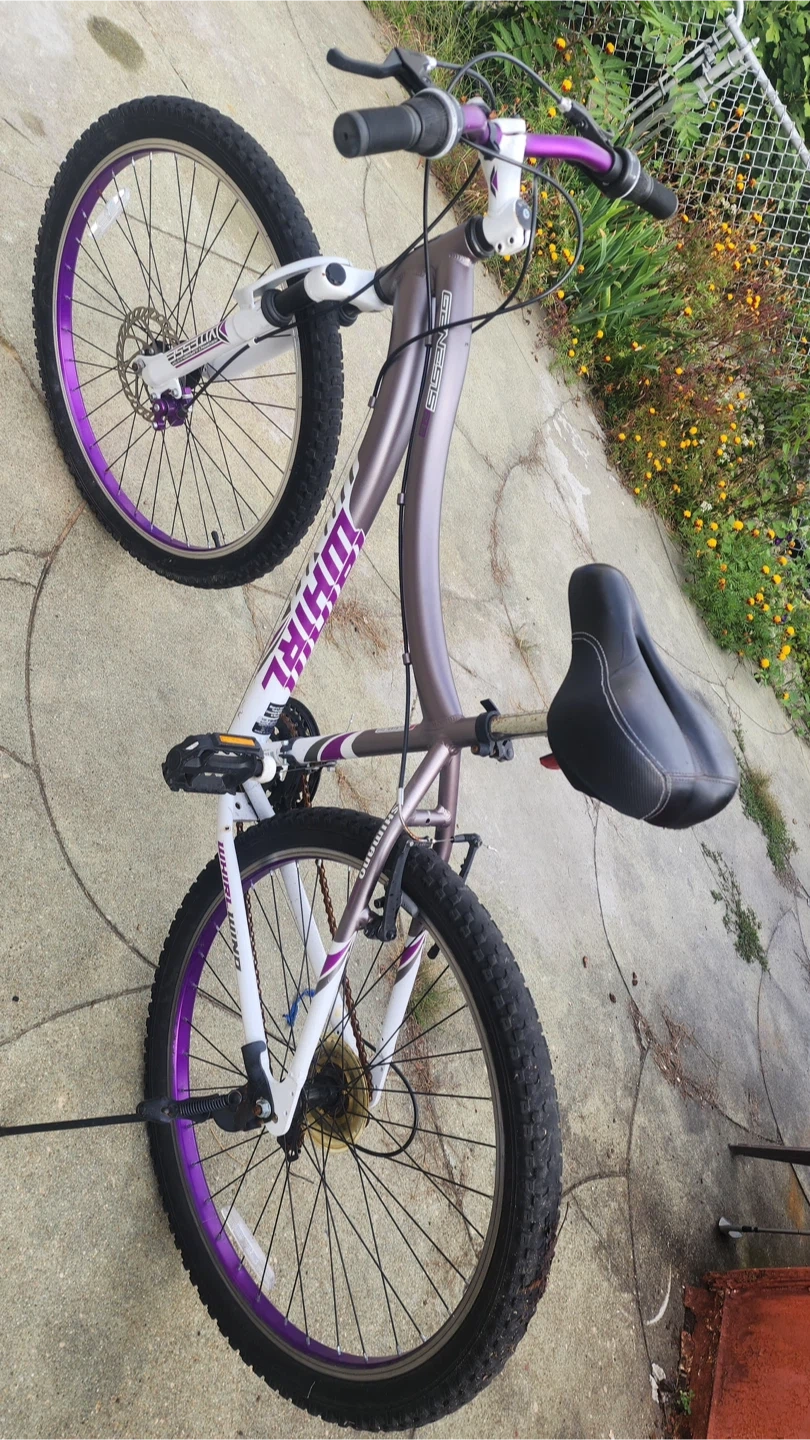 Selling a Genesis Whirl girls' bike in purple and white. It's in good condition and ready for a new rider!