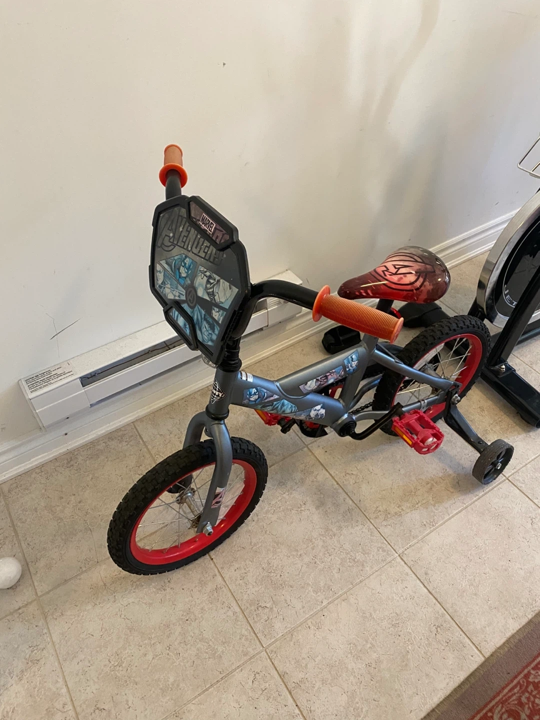Selling a Marvel Avengers kids' bike! It's in good condition and ready for a new rider. This bike features cool Avengers graphics and is perfect for young fans learning to ride. It includes training wheels for added stability. The tires have red accents, and the seat also has matching Avengers detailing
