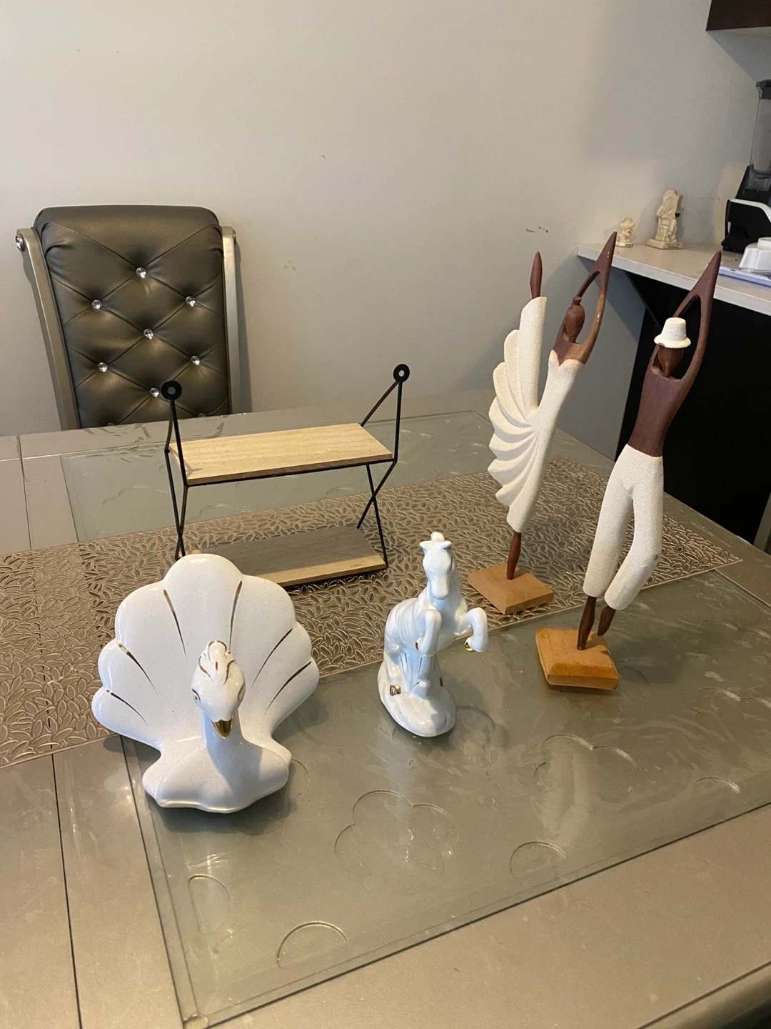 Selling a collection of unique decorative figurines! Includes a white peacock figurine with gold accents, a small white horse figurine, and two wooden figurines of dancers. Perfect for adding a touch of character to your home decor $5 each