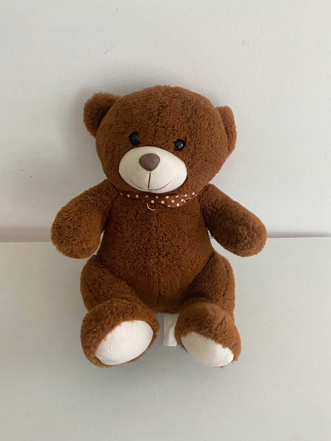 A cute and cuddly brown teddy bear is looking for a new home! It features a brown polka dot collar and white paws. Perfect for kids or anyone who loves a soft plushie