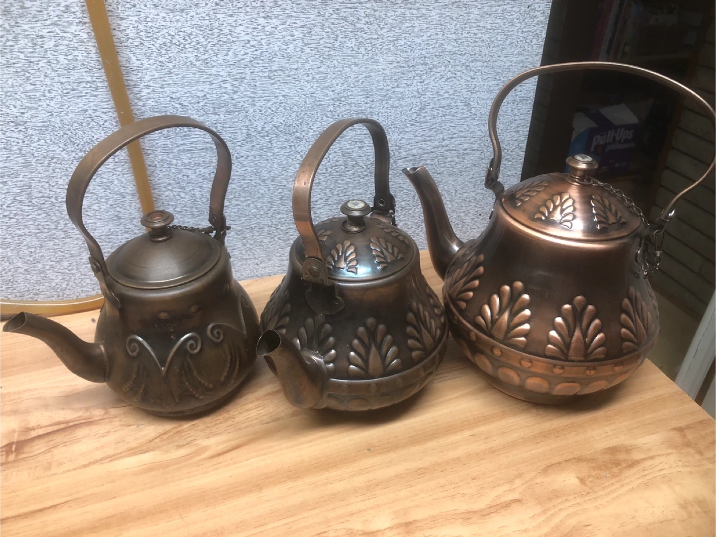 Selling a set of three vintage copper teapots! They have a lovely patina and decorative leaf patterns. Perfect for adding a touch of rustic charm to your kitchen or collection
