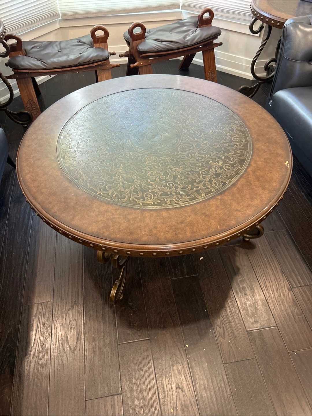 Selling a round coffee table and two side tables with a unique metal base. It has a brown top with a decorative pattern. Perfect for adding a touch of elegance to your living room!