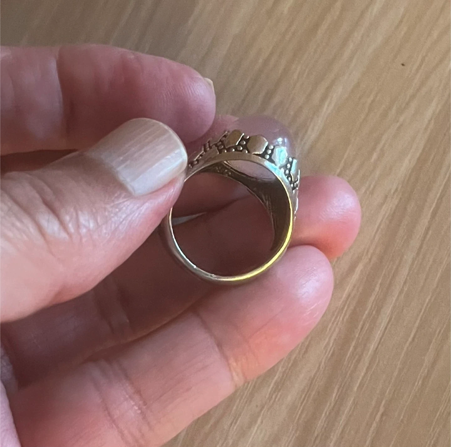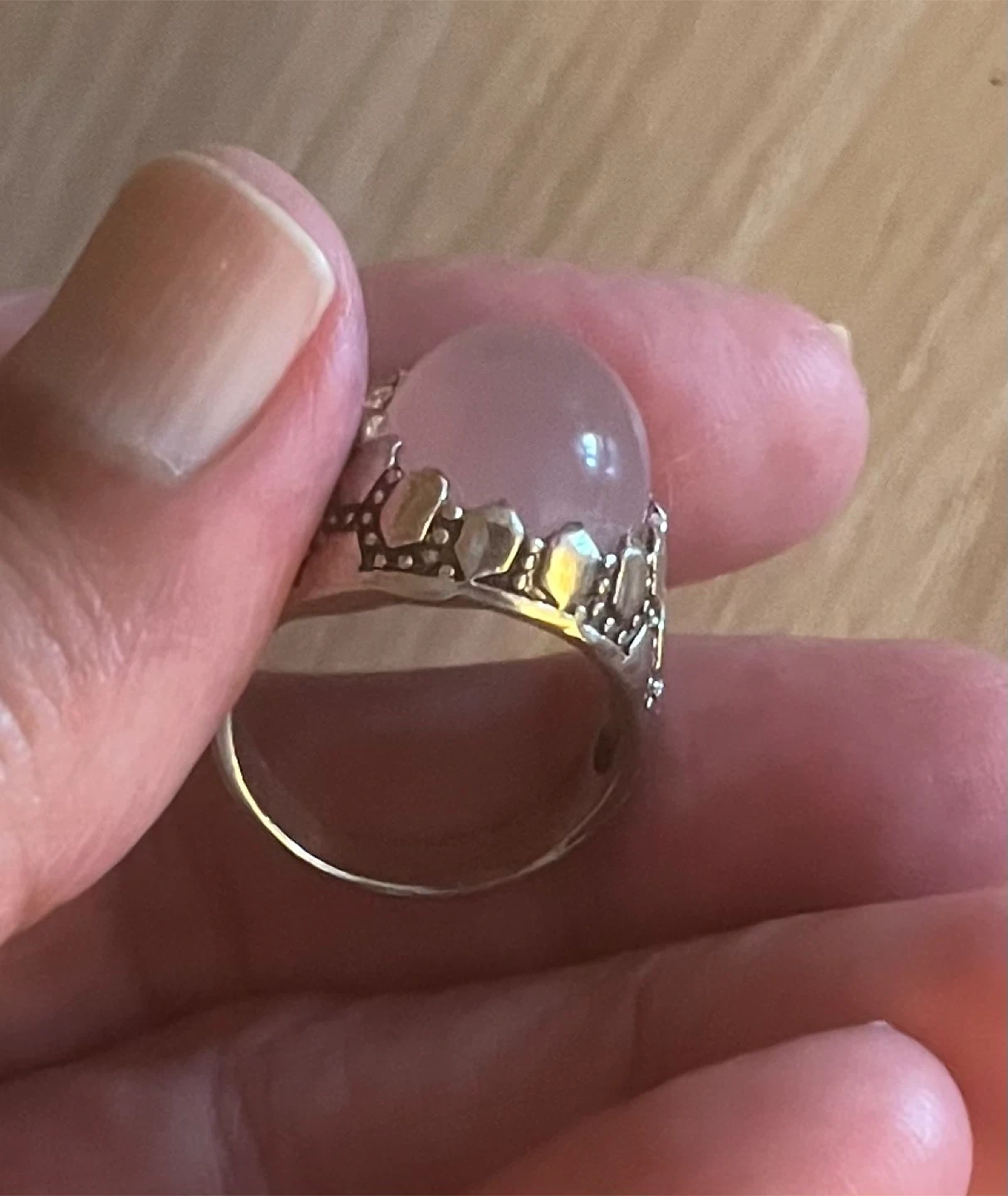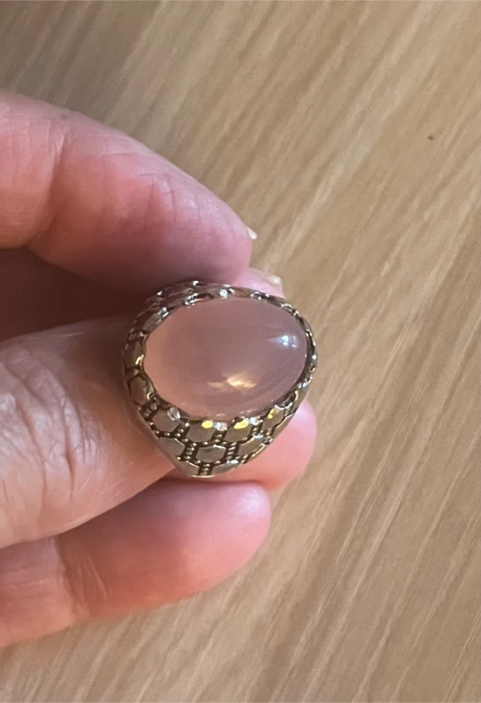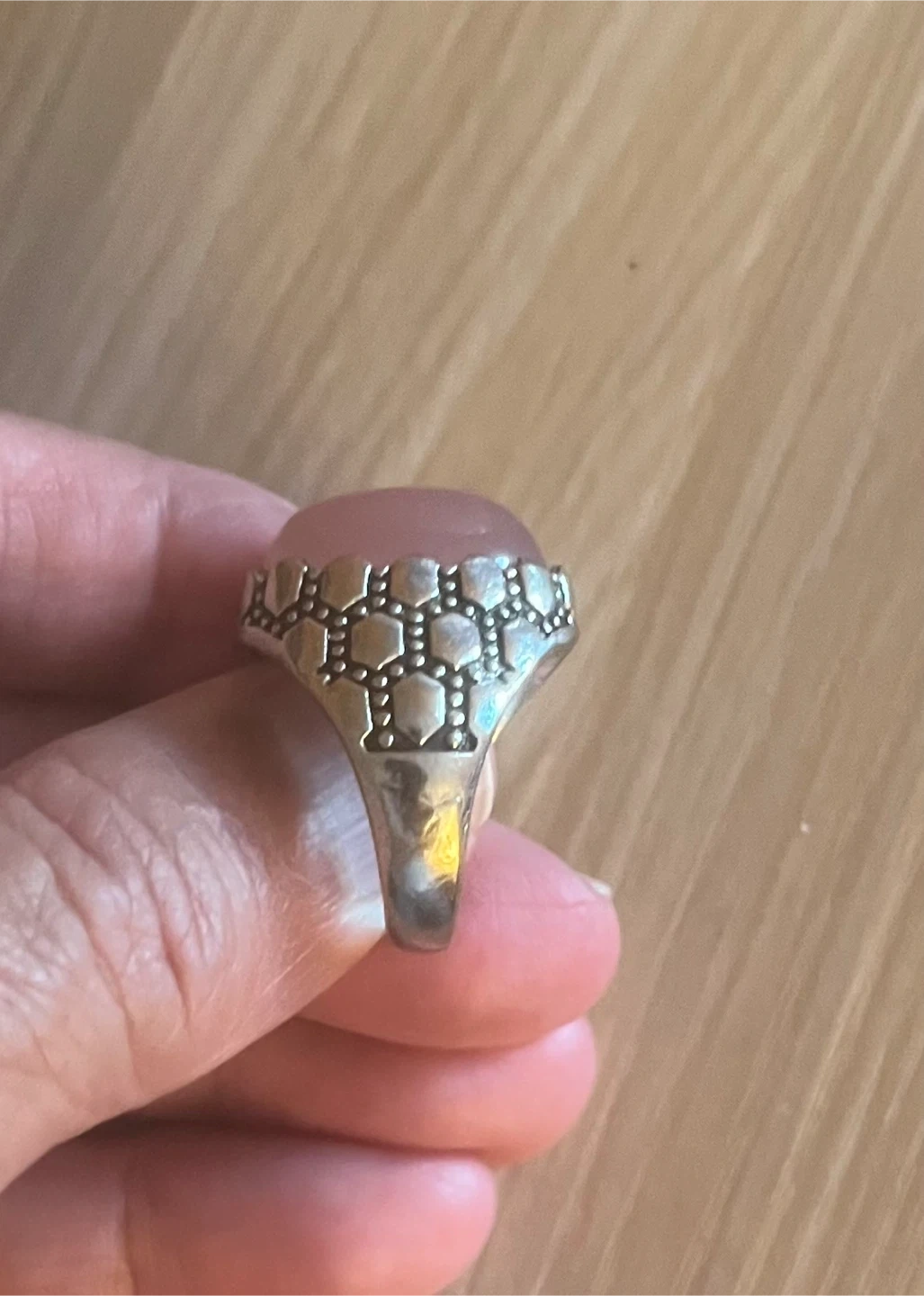 Selling a lovely vintage ring featuring a beautiful pink stone. It has a unique design around the stone setting. Perfect for adding a touch of vintage charm to any outfit!