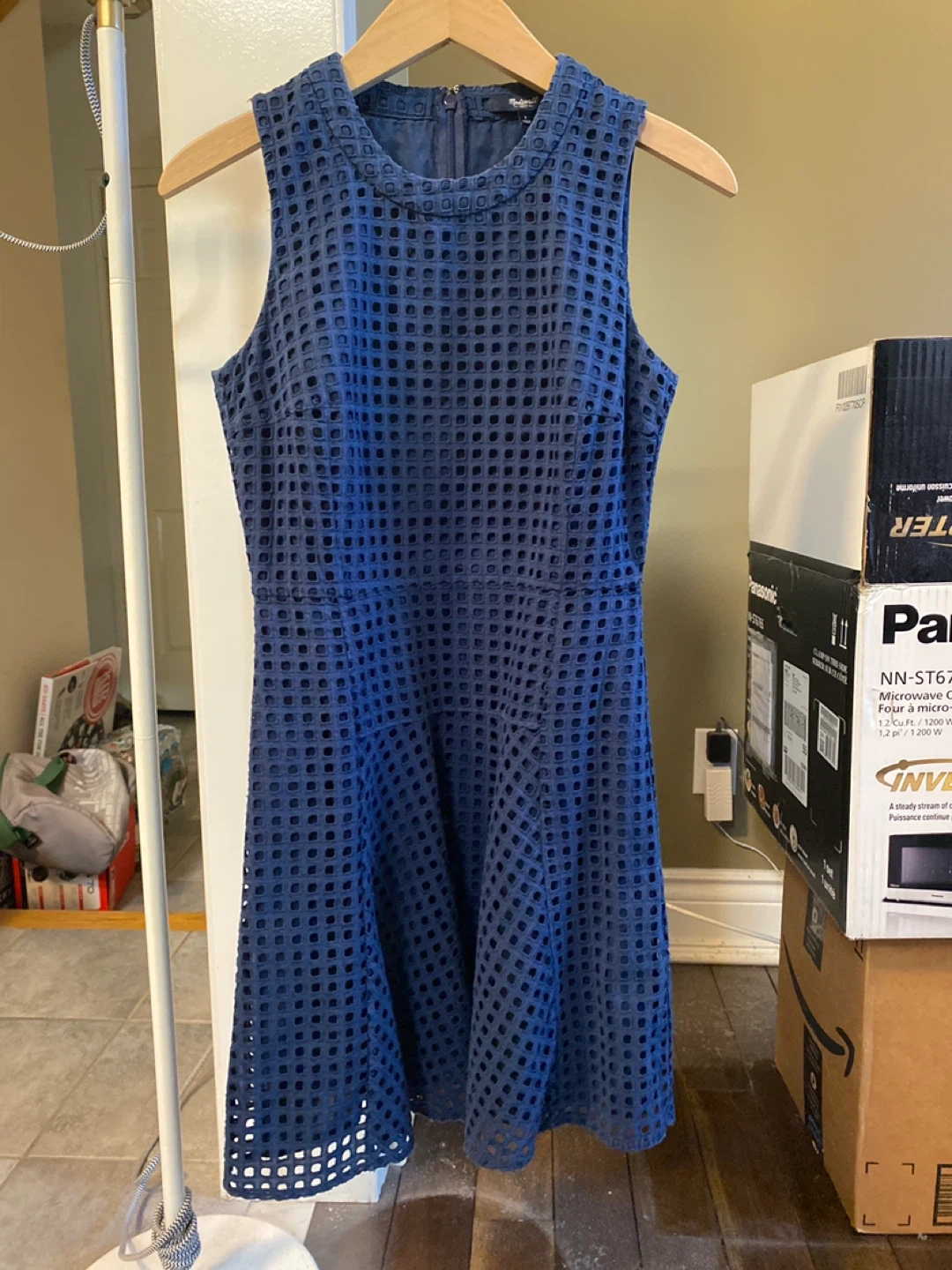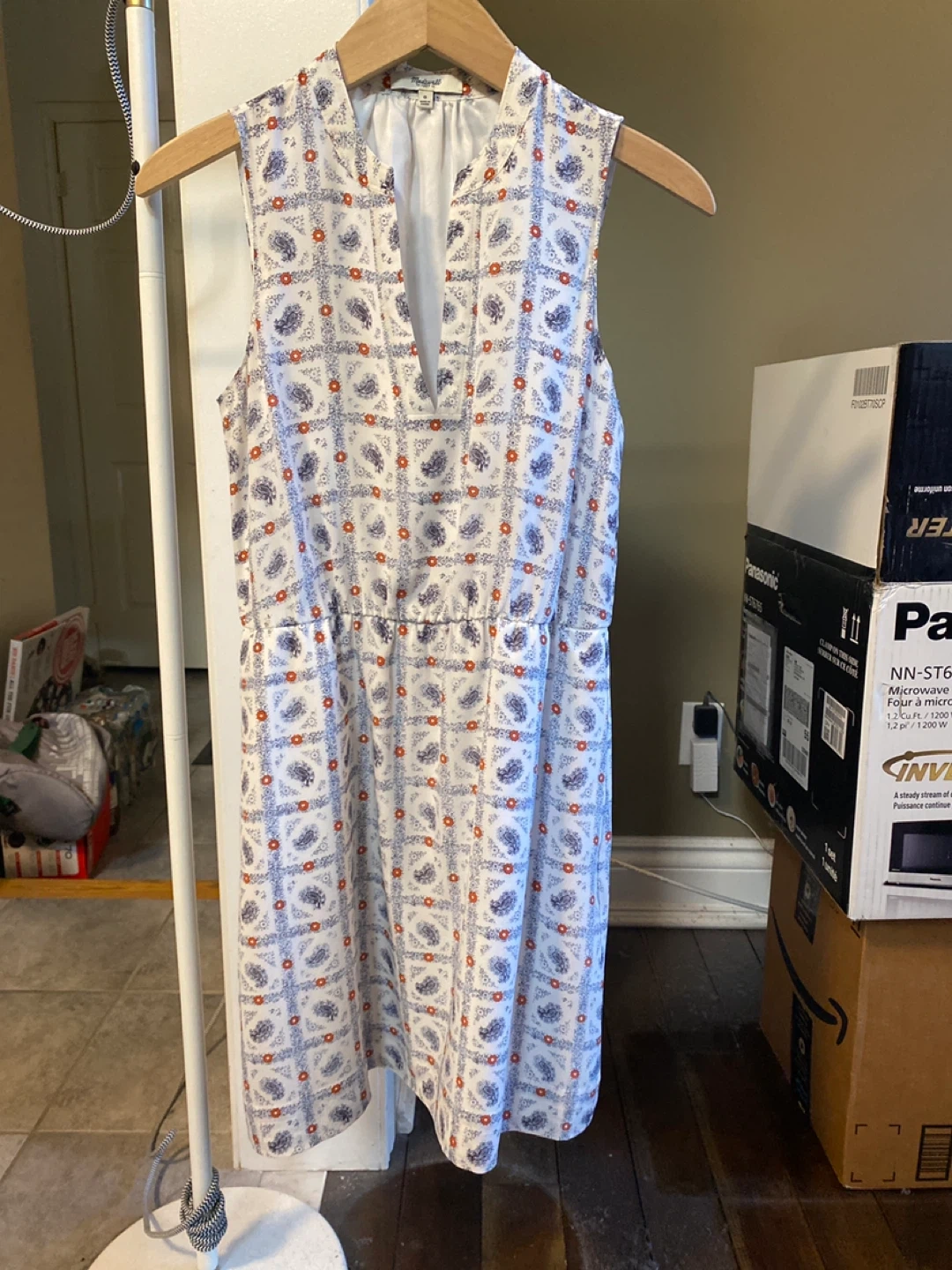 I'm selling two Madewell dresses, Navy in size 2 and White in size 0. One is a navy blue grid pattern, and the other is a white patterned dress. Both are in good condition and ready for a new home!