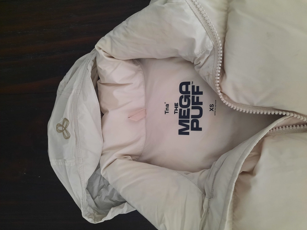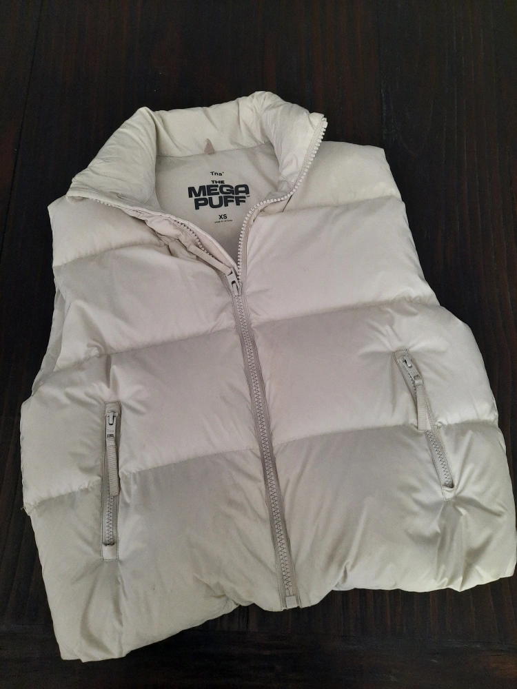 Selling a Tna The Mega Puff vest in size XS. It's a beautiful, cream colour and in great condition. Features a 700+ fill power, responsibly sourced down for superior warmth without the weight. The vest is water-repellent and wind-resistant thanks to its CLIMATE LAB™ fabric. Perfect for layering or wearing on its own!