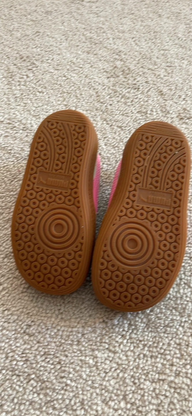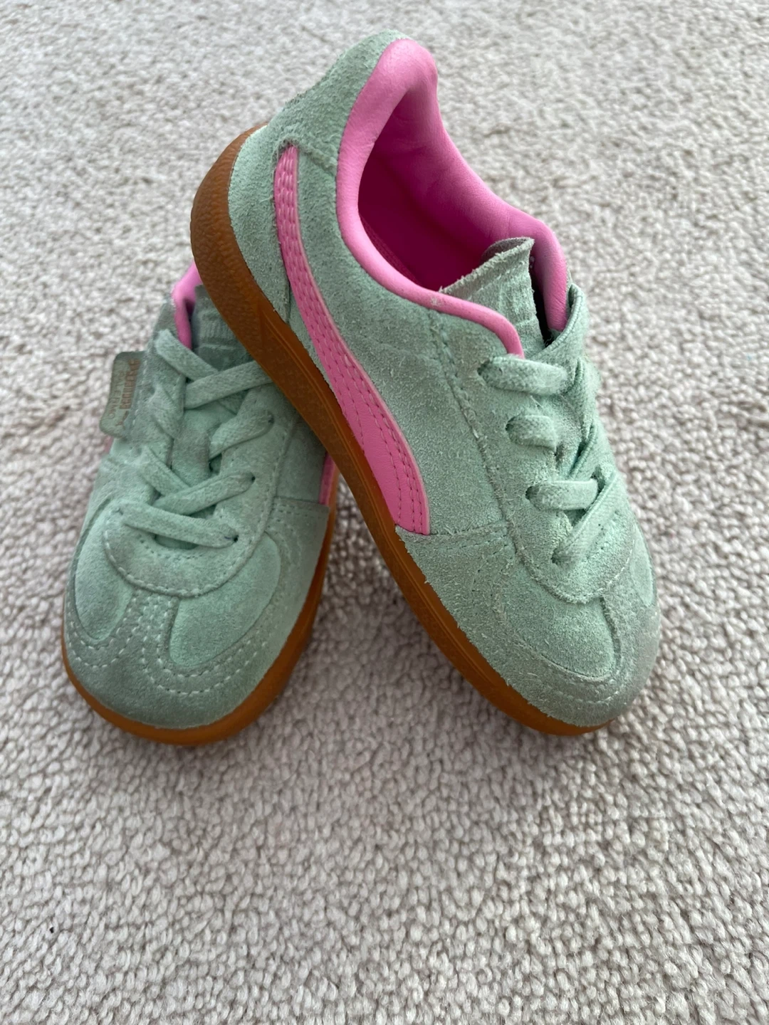 These adorable Puma Palermo baby shoes are in great condition! They feature a stylish green suede upper with pink accents.