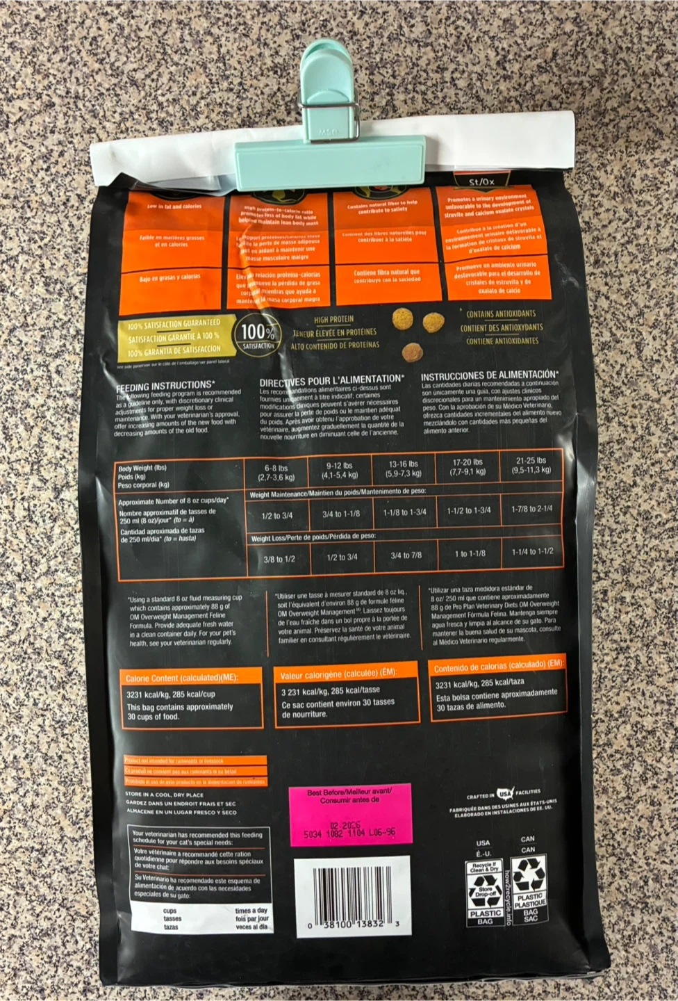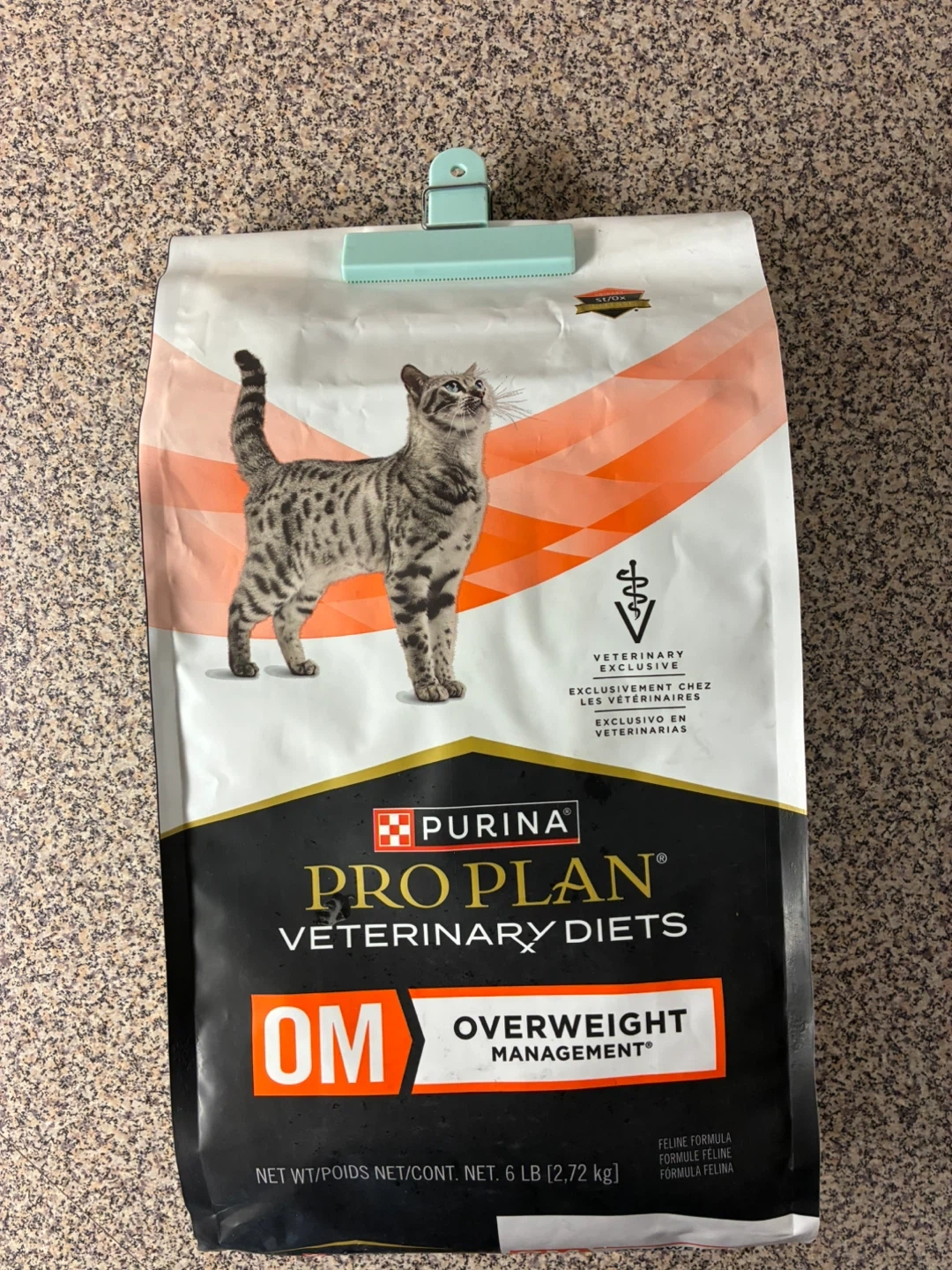 OPENED- bag of Purina Pro Plan Veterinary Diets OM (Overweight Management) feline formula.