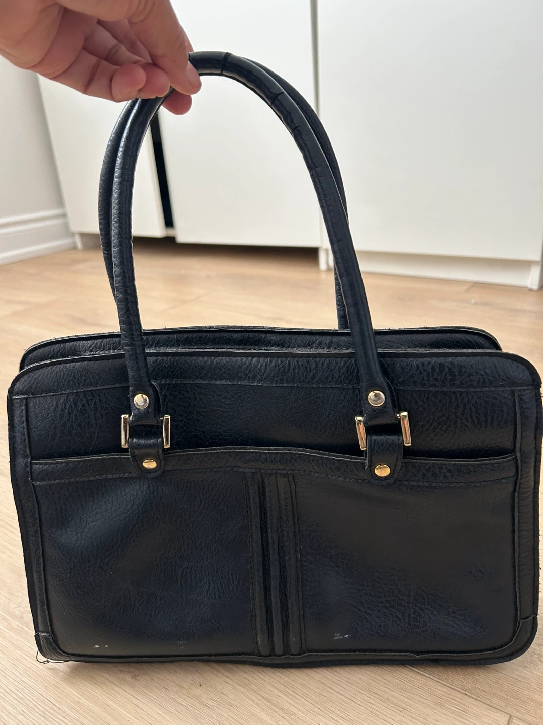 Classic black leather handbag in good condition. Perfect for work or everyday use. It features a structured design with sturdy handles and multiple pockets for organization. A stylish and practical addition to any wardrobe!