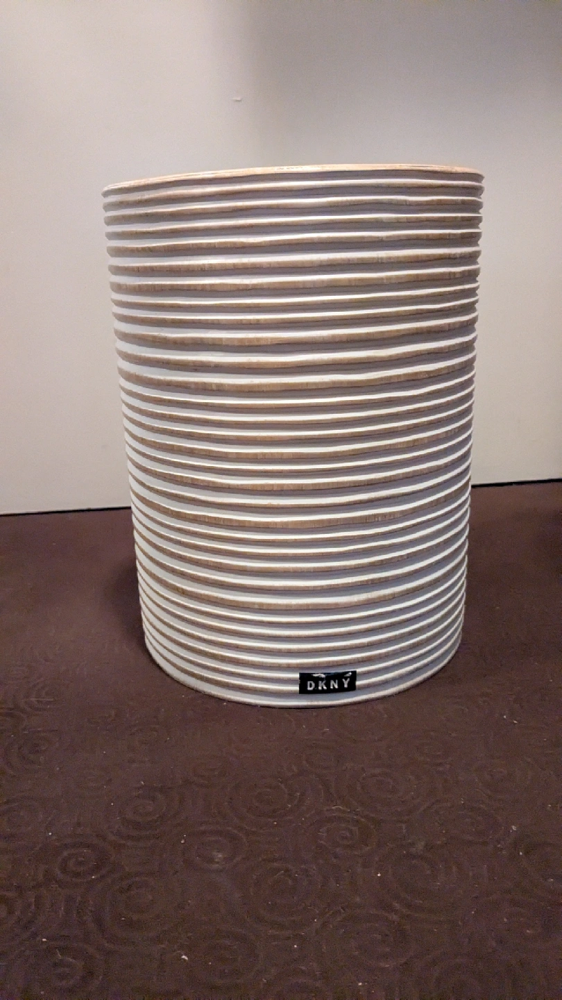 Here's a stylish DKNY decorative waste basket (these sell for over $100 online)! It's perfect for adding a touch of modern elegance to any room. The basket features a unique design with horizontal stripes, adding visual interest and texture.