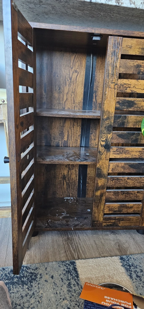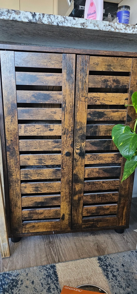 Selling a rustic brown wooden cabinet. It has a charming, distressed look. Perfect for adding some character to your space! It features interior shelves for storage hardly used. its basically new