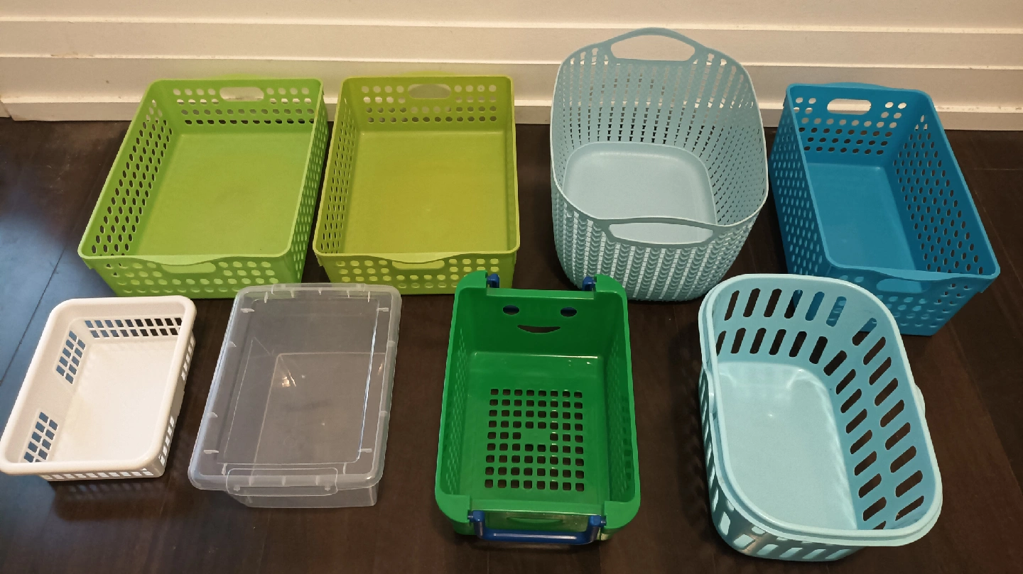 Selling a collection of assorted storage baskets in various colours and sizes! Great for organizing your home, office, or kids' room. Includes green, blue, white, and clear options. All in good condition and ready for a new home