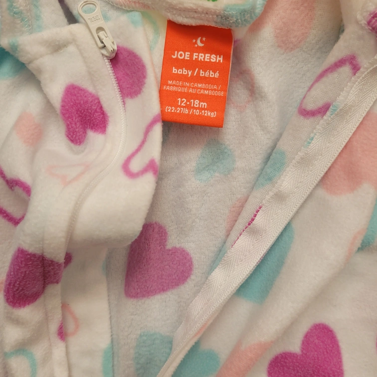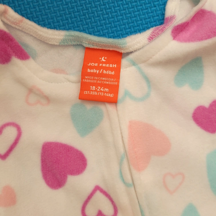 I have two Joe Fresh baby sleep sacks for sale. One is size 12-18 months and the other is 18-24 months. They both have a cute heart pattern. Perfect for keeping your little one cozy!