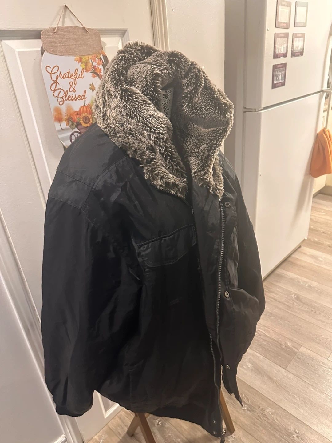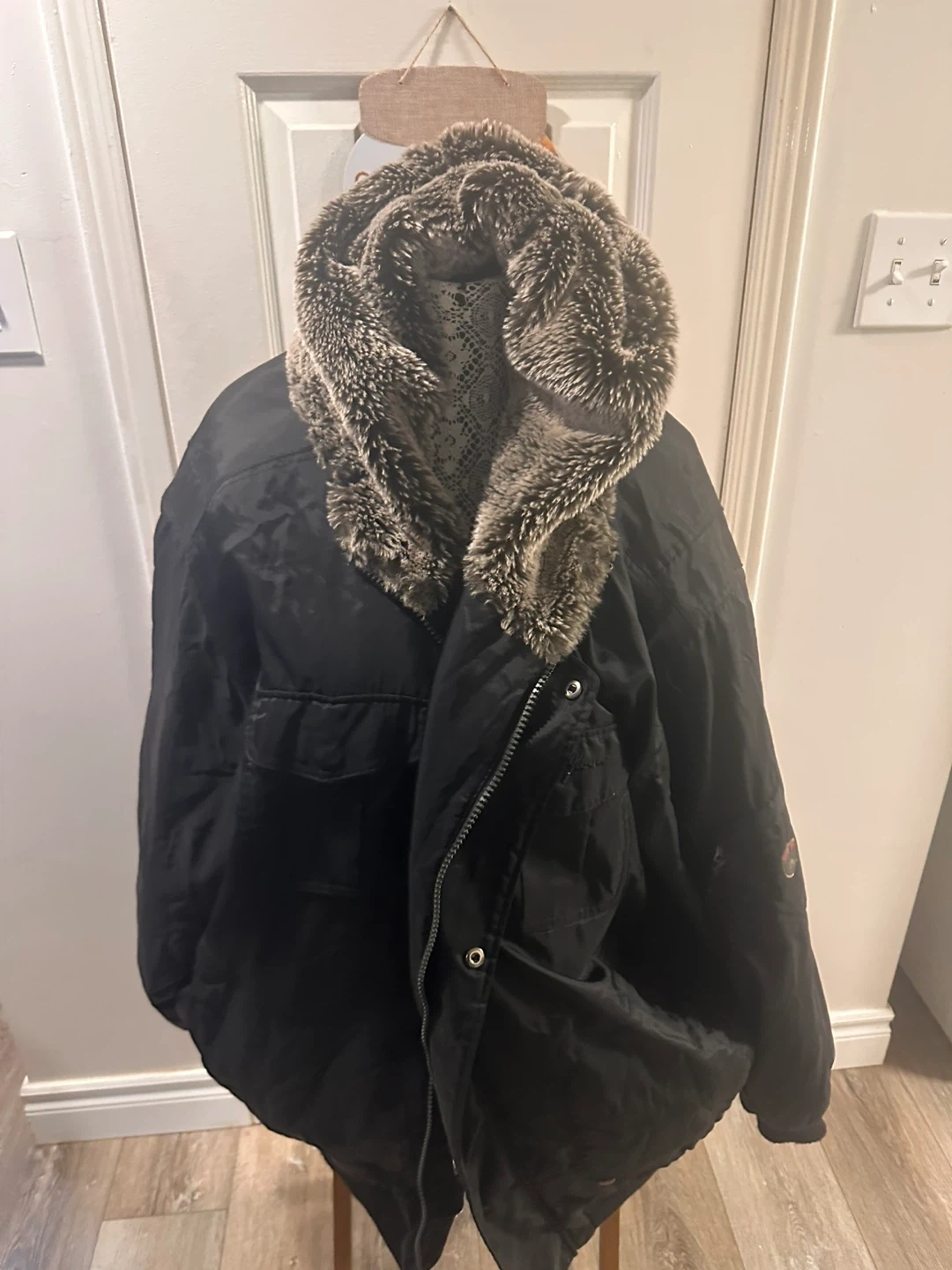Selling a Phat Farm winter jacket in size XXXXL. It's black and has a faux fur lining. The shell is made of 100% nylon and the lining is made of polyester.