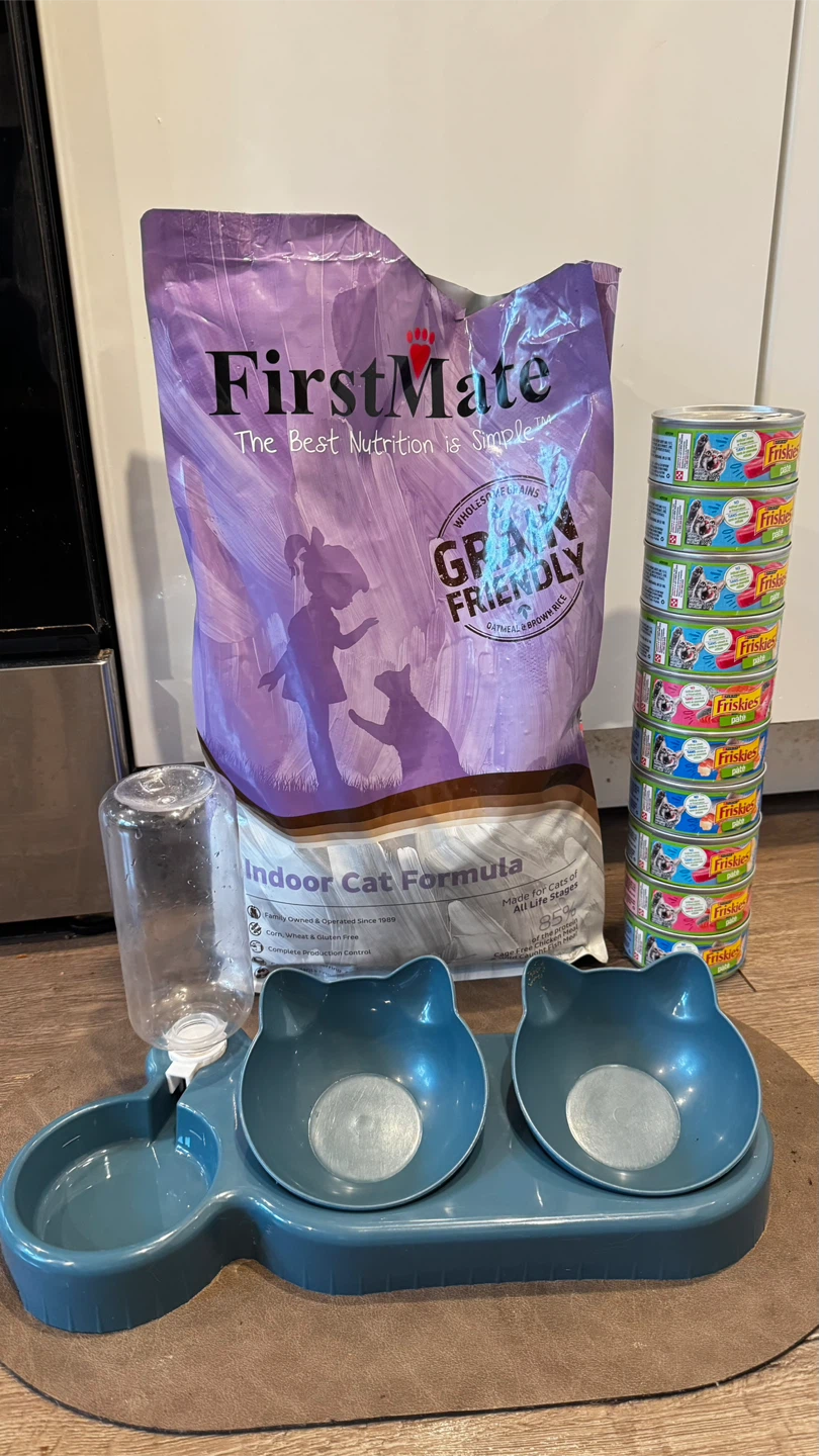 Selling a gently used cat food and water bowl set! It's in great condition and perfect for your feline friend. Also included is a bag of FirstMate Indoor Cat Formula and some Friskies wet food.