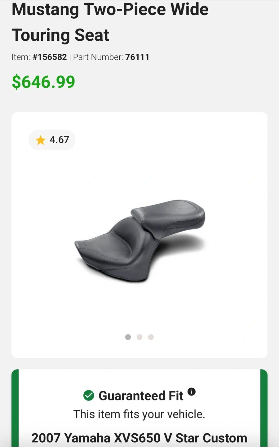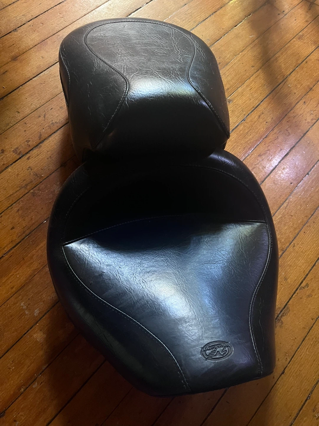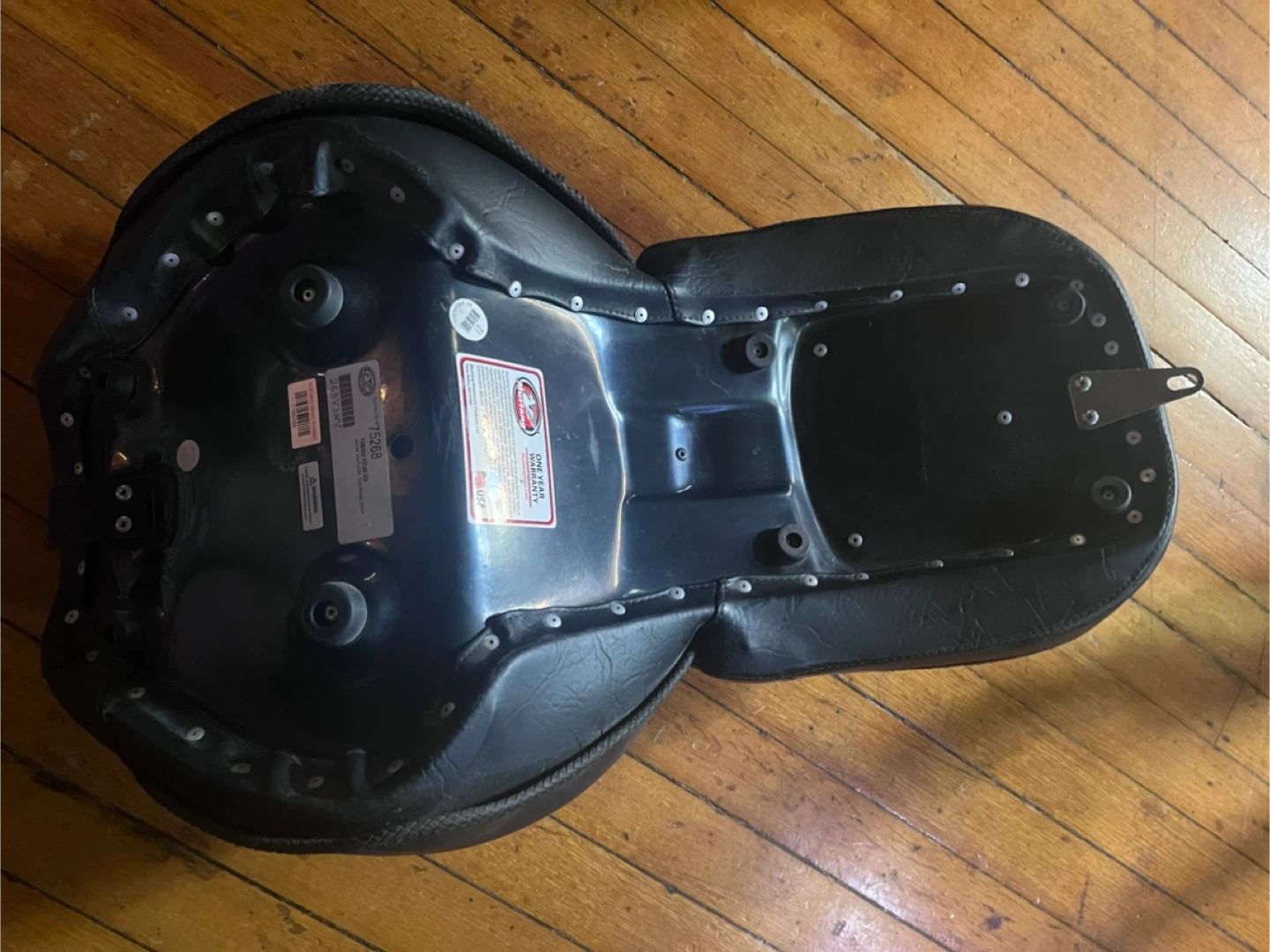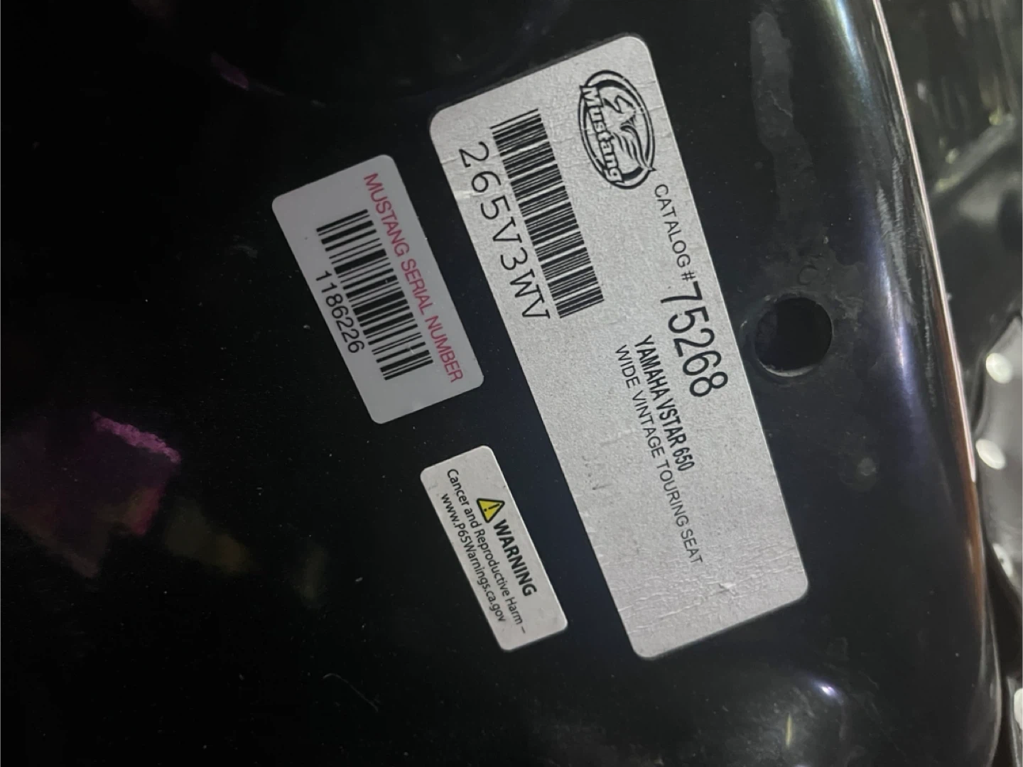 Mustang Wide Vintage Touring Seat for a Yamaha V Star 650. It's in good condition minus a minor snag as shown in the second photo. Guaranteed fit for 2007 Yamaha XVS650 V Star Custom.