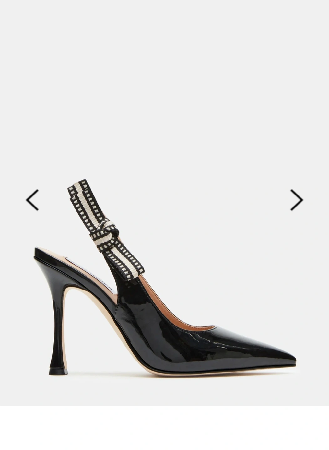 These Steve Madden slingback heels are super stylish! They feature a black patent finish and a unique striped detail on the slingback strap. Perfect for dressing up any outfit!