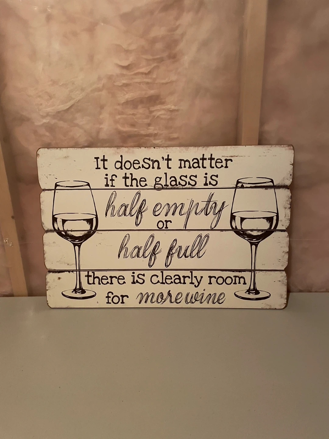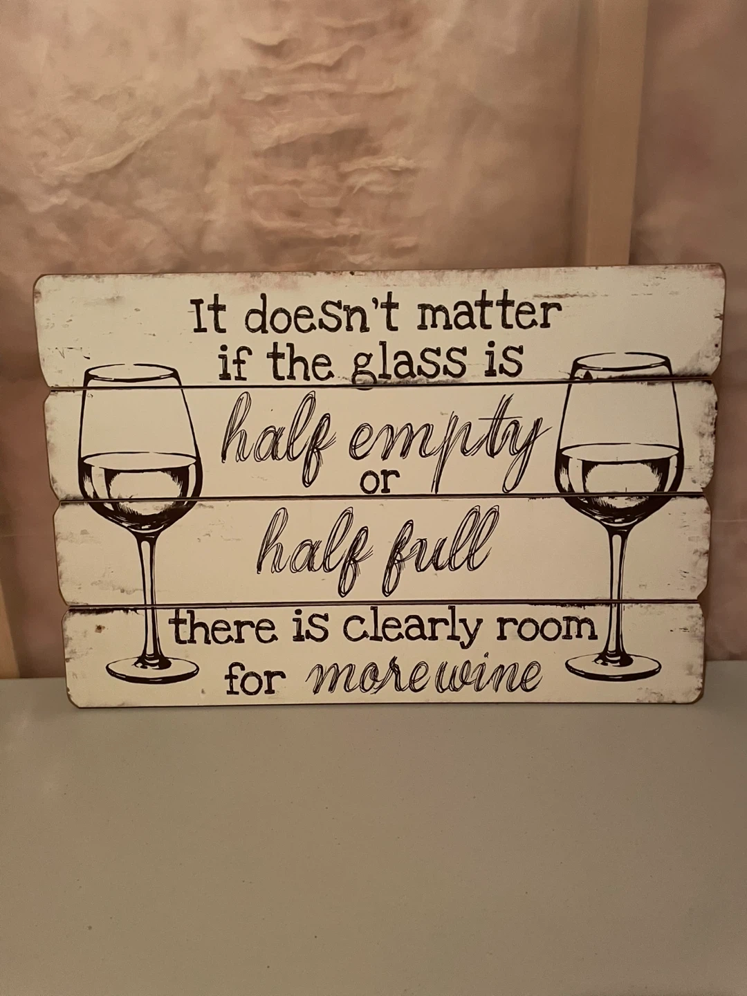 Cute wine-themed sign for your home bar or kitchen! It says "It doesn't matter if the glass is half empty or half full, there is clearly room for more wine" $10
