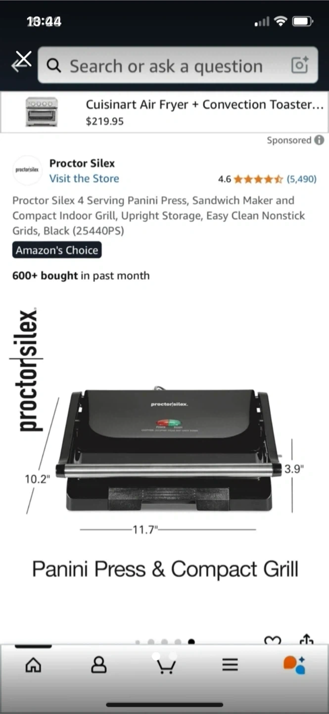 Selling a Proctor Silex panini press and compact grill. It's a 4-serving size, perfect for making sandwiches and grilling indoors. It features nonstick grids for easy cleaning and upright storage. Dimensions are approximately 11.7" x 10.2" x 3.9".