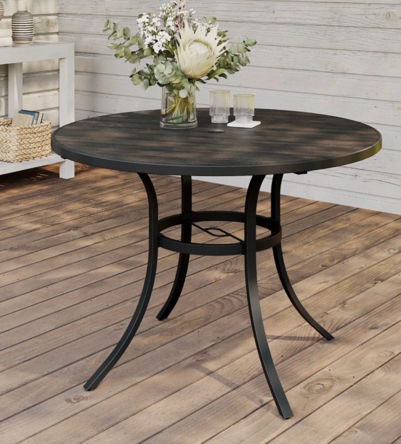 Looking to sell this round I door/ outdoor dining table! It features a dark wood-look top and a sturdy black metal frame. It's perfect for enjoying meals outside on your patio or deck. It's in great shape and ready for a new home!