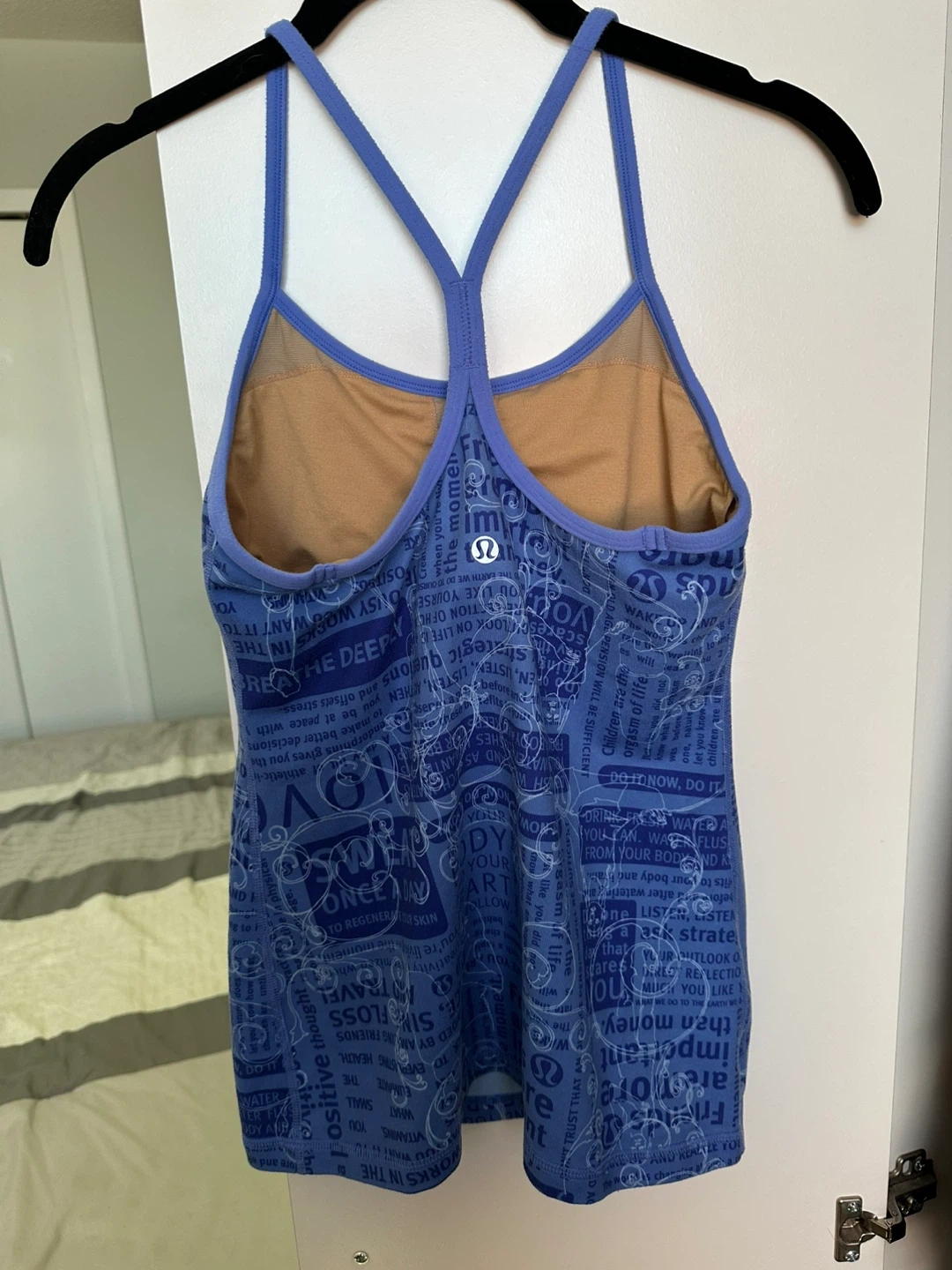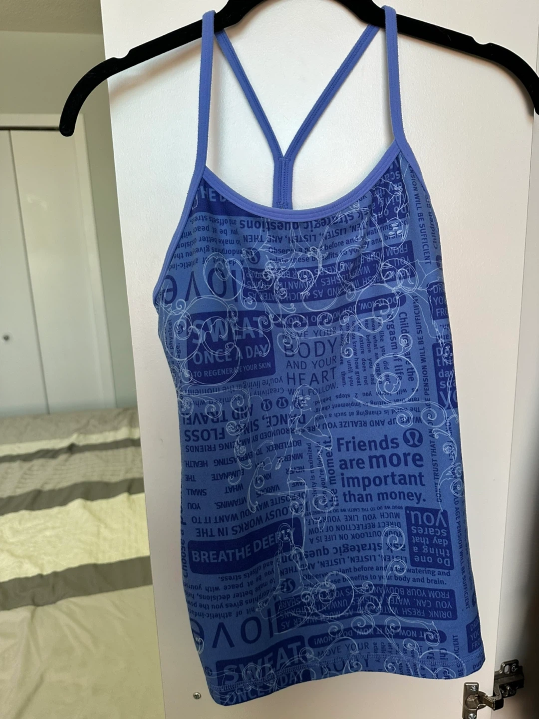 Selling a Lululemon tank top in size 6. It's in great condition and ready for a new home! The material is comfortable and perfect for workouts or casual wear. The design features a unique print. It's a stylish and functional addition to your activewear collection