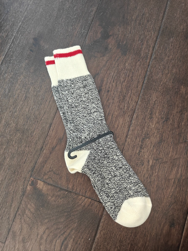 Cozy Roots cabin socks, perfect for keeping your feet warm during those chilly Canadian nights! These socks feature a classic design with a red and cream stripe at the top and a cream heel and toe. The main body of the sock is a grey and cream knit. Great for lounging at home or wearing with your favourite boots