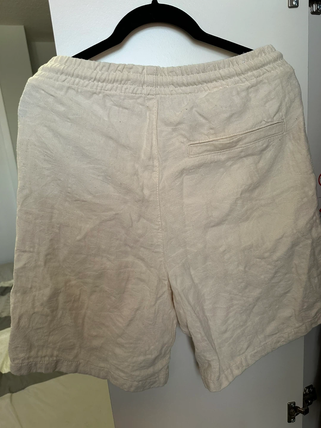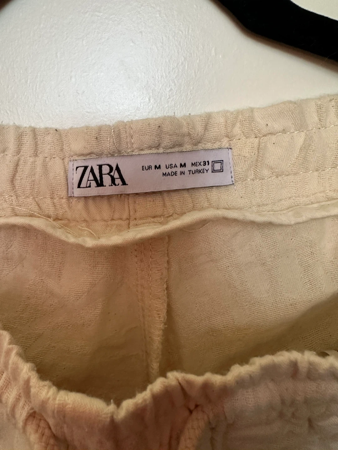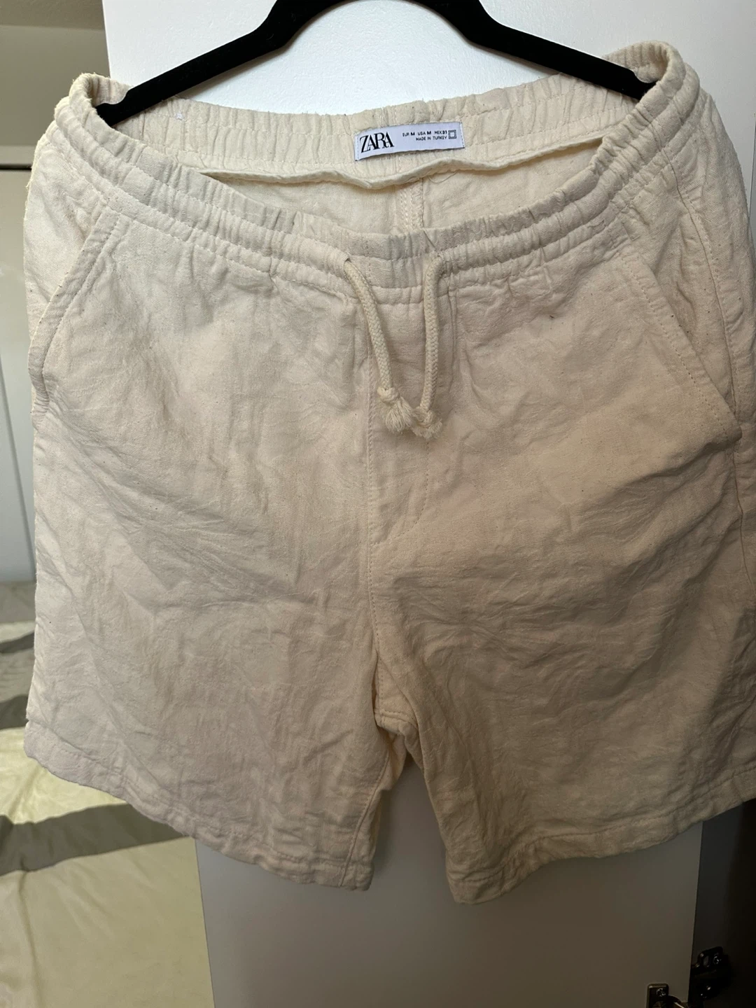 Selling a pair of Zara cream-coloured shorts. They're a size medium and made from a linen blend, perfect for staying cool and comfy. These shorts have a relaxed fit with an elasticated waist and drawstring. They're in great condition and ready for a new home
