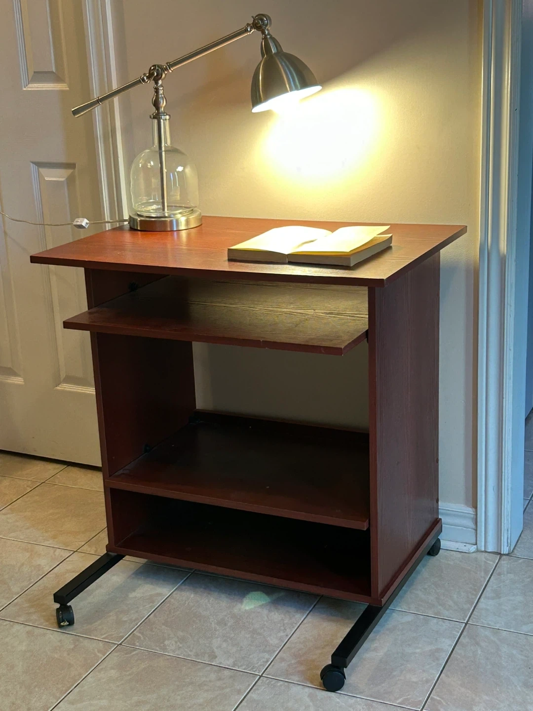 A lovely wooden desk with a pull-out keyboard shelf and two additional shelves for storage. It's perfect for a small workspace or as a side table. The desk is in great condition and ready for a new home!