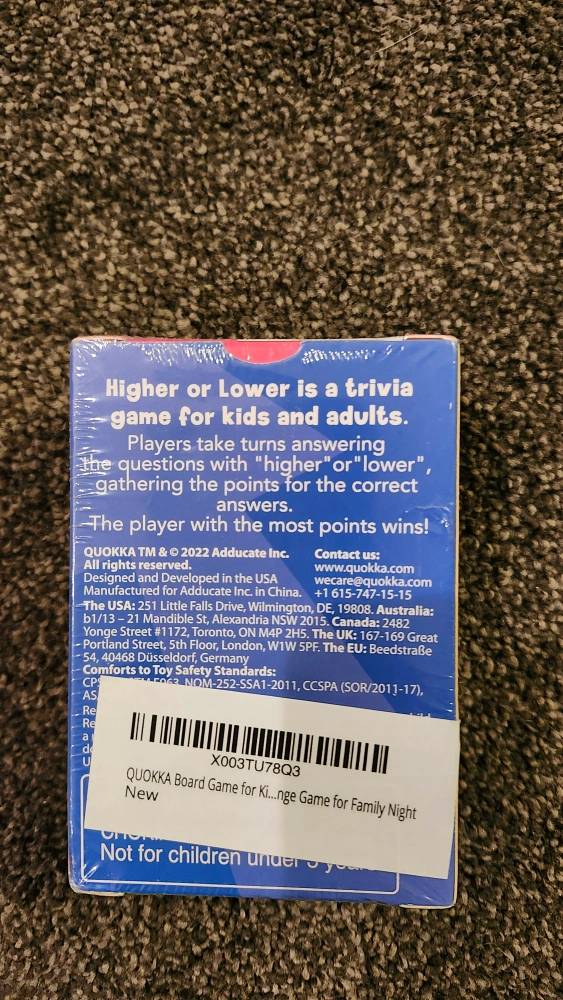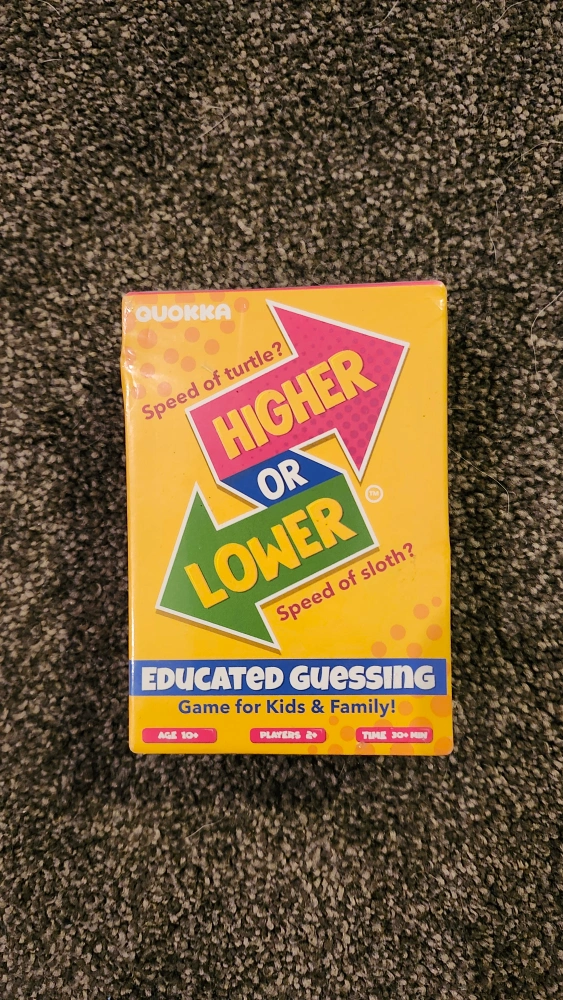 I'm selling a brand new QUOKKA 'Higher or Lower' trivia game! This is a fun, educated guessing game for kids and family. It's designed for ages 10+, with 2+ players, and a playtime of 30+ minutes. It's a trivia game for kids and adults where players take turns answering the questions with 'higher' or 'lower', gathering the points for the correct answers