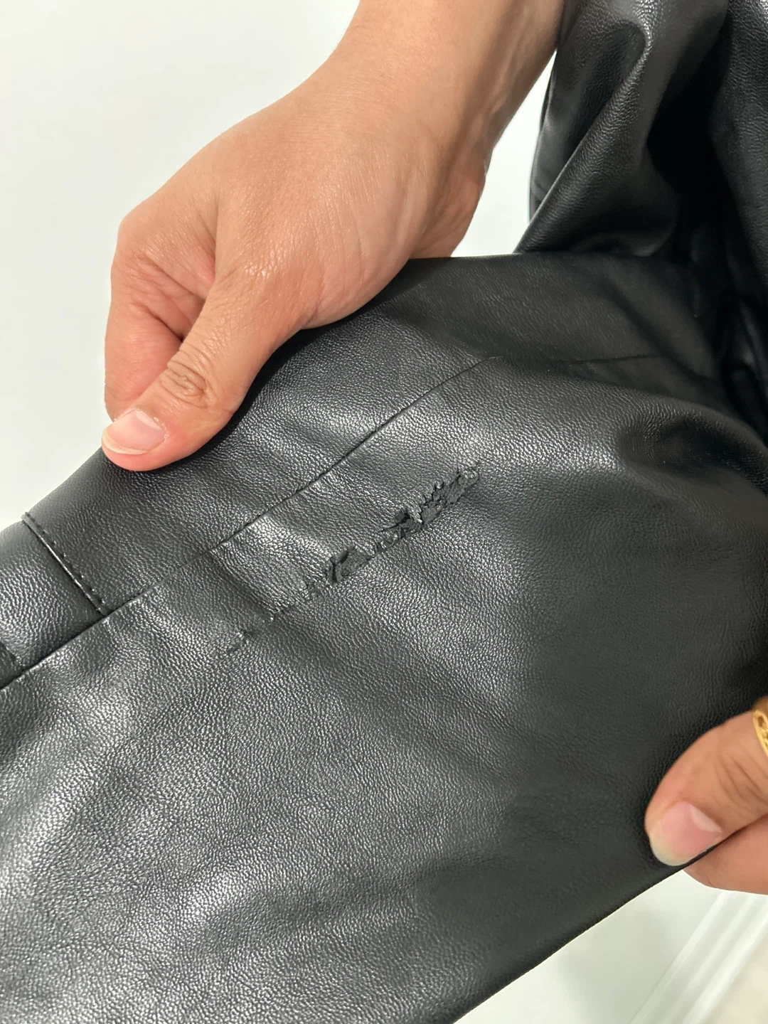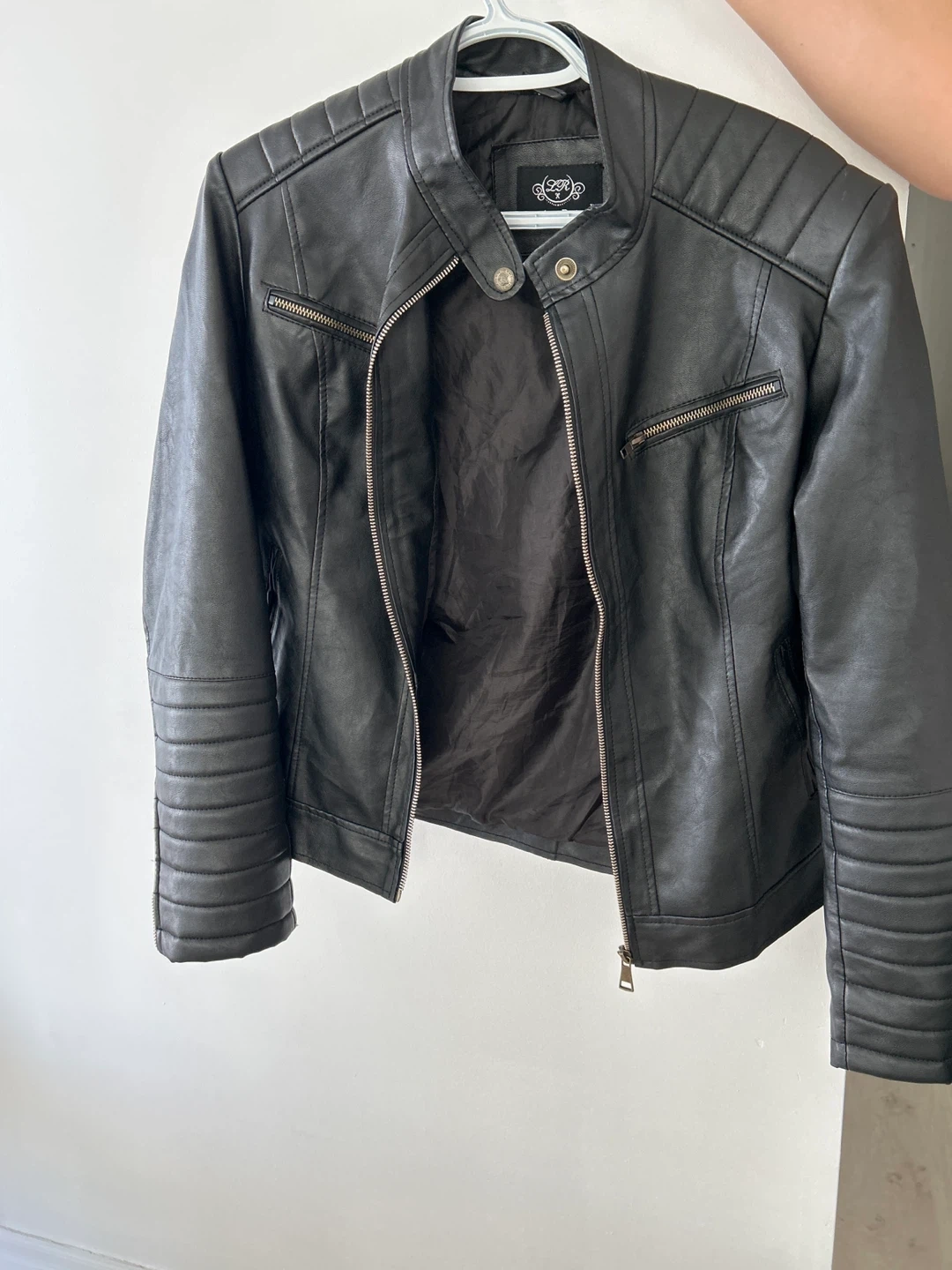 Selling a black faux leather jacket in 1 Minor scratch condition! It has a stylish design with zippered pockets and quilted detailing on the shoulders and sleeves. Perfect for adding a bit of edge to any outfit.