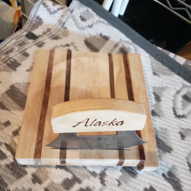 Selling an Alaska Ulu knife with its matching cutting board! The knife has 'Alaska' written on the handle and a cute design etched on the blade. It's perfect for chopping herbs or veggies. The board is made of wood with darker wood stripes. Great for anyone who loves Alaskan souvenirs or needs a handy kitchen tool!