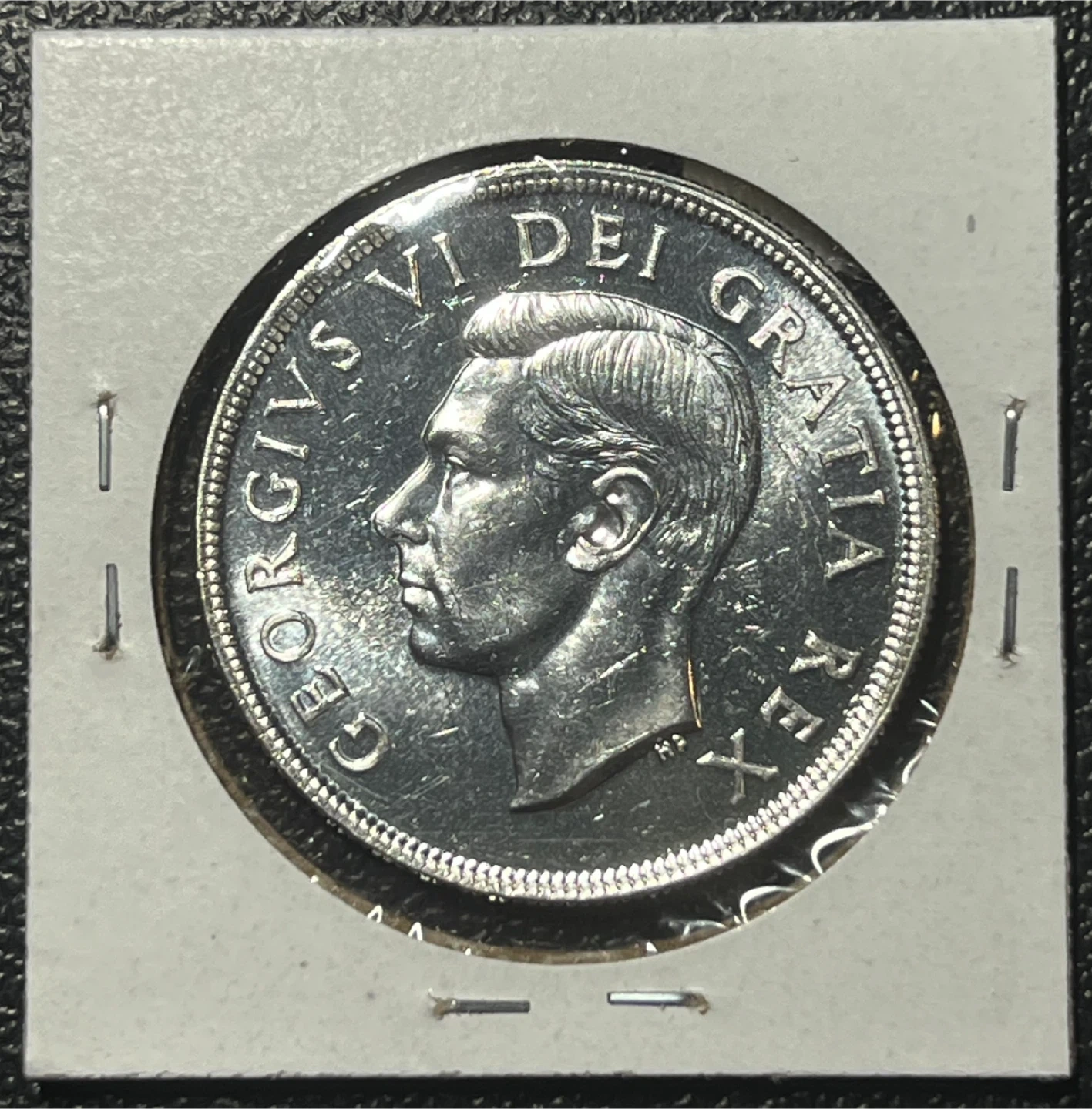Selling a 1949 Canadian Silver Dollar. It appears to be in uncirculated condition (UNCT). A great piece for collectors!
