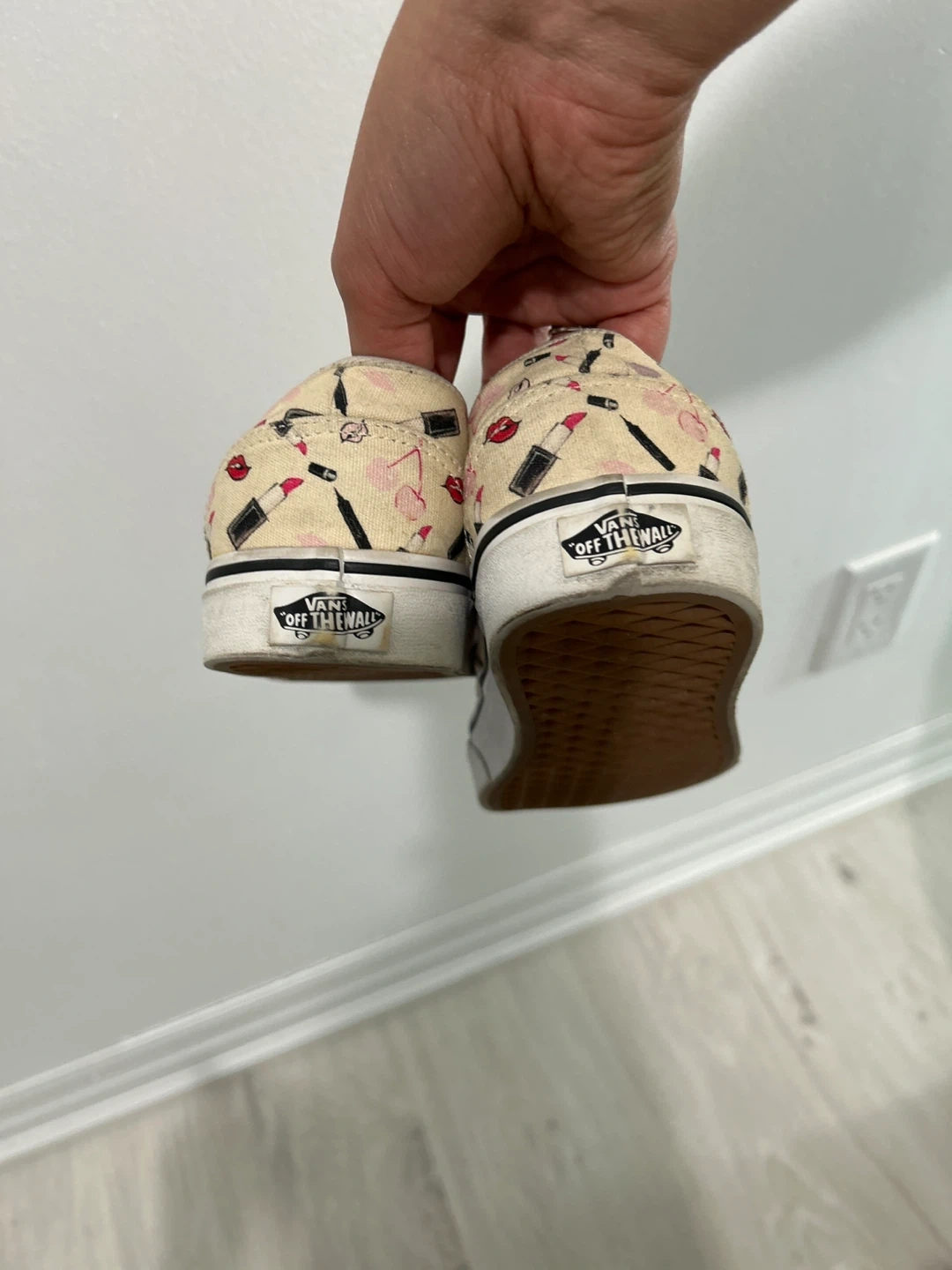 Selling a pair of Vans slip-on shoes with a fun cosmetic print! These are in good condition and ready for a new home. They feature a white sole and a unique design with lipstick and makeup motifs. Size is not indicated on the shoe.(US 8)