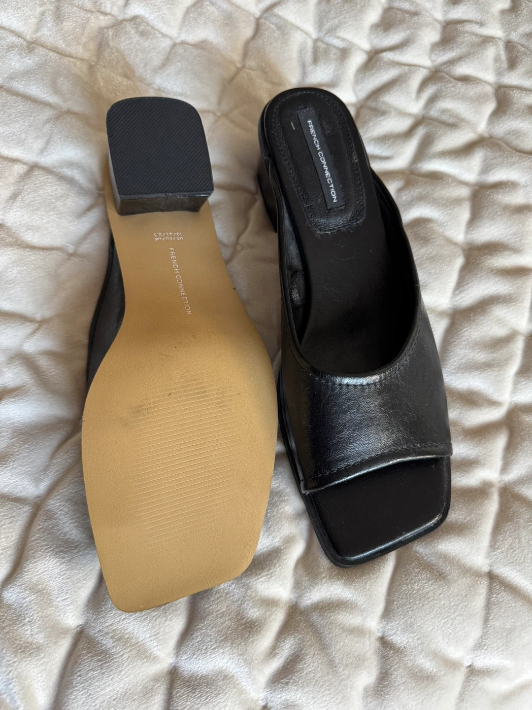 These black leather mules from French Connection are a stylish and comfortable addition to any wardrobe! They are in great condition and ready for a new home. The size is US 10 They feature a classic square toe and a low block heel, perfect for everyday wear.