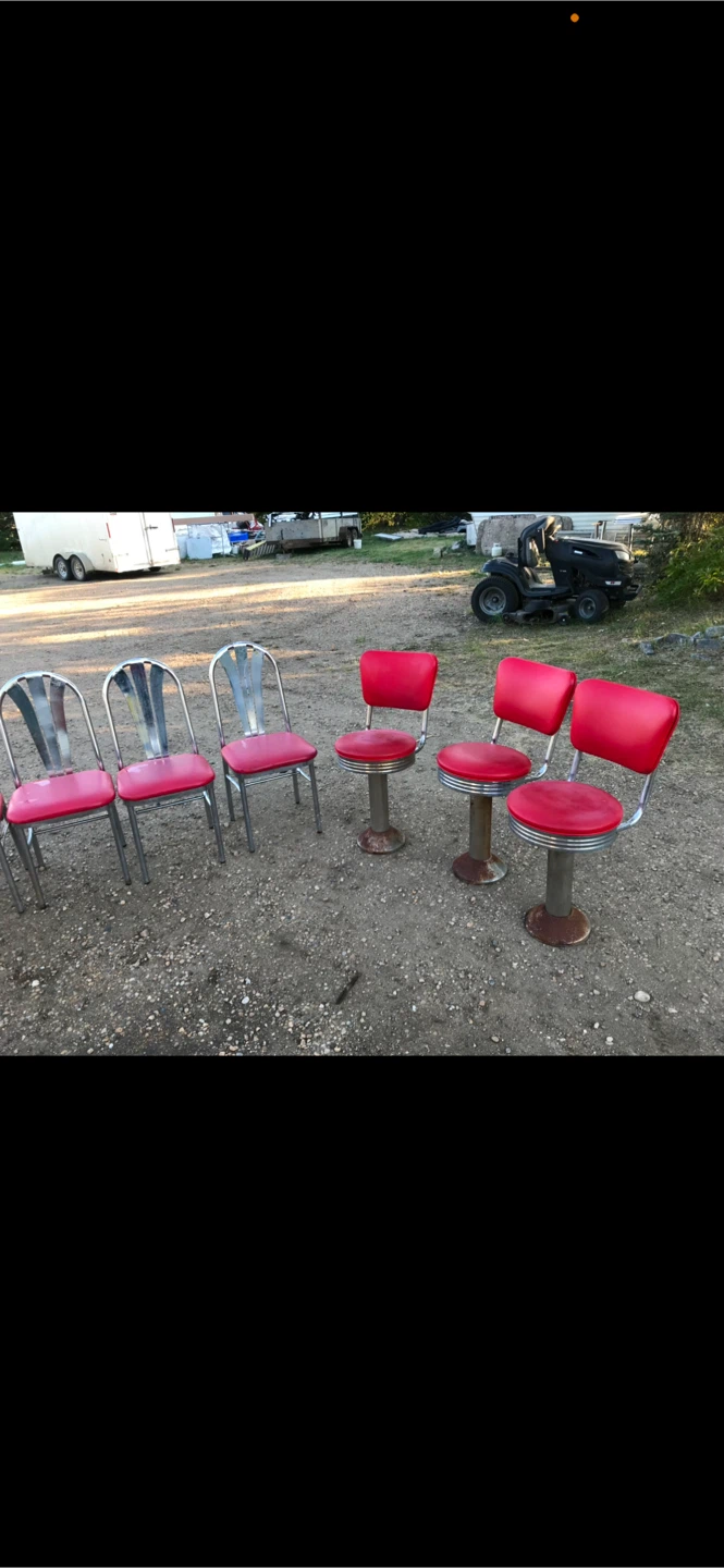Selling a set of retro dining chairs with red seats and chrome frames. 8 Vintage chrome chairs 3 tables 3 swivel chairs . Great for adding a vintage touch to your dining area or kitchen! They're in good condition and ready for a new home. Pick up near Morinville. Please call 825-977-7001.