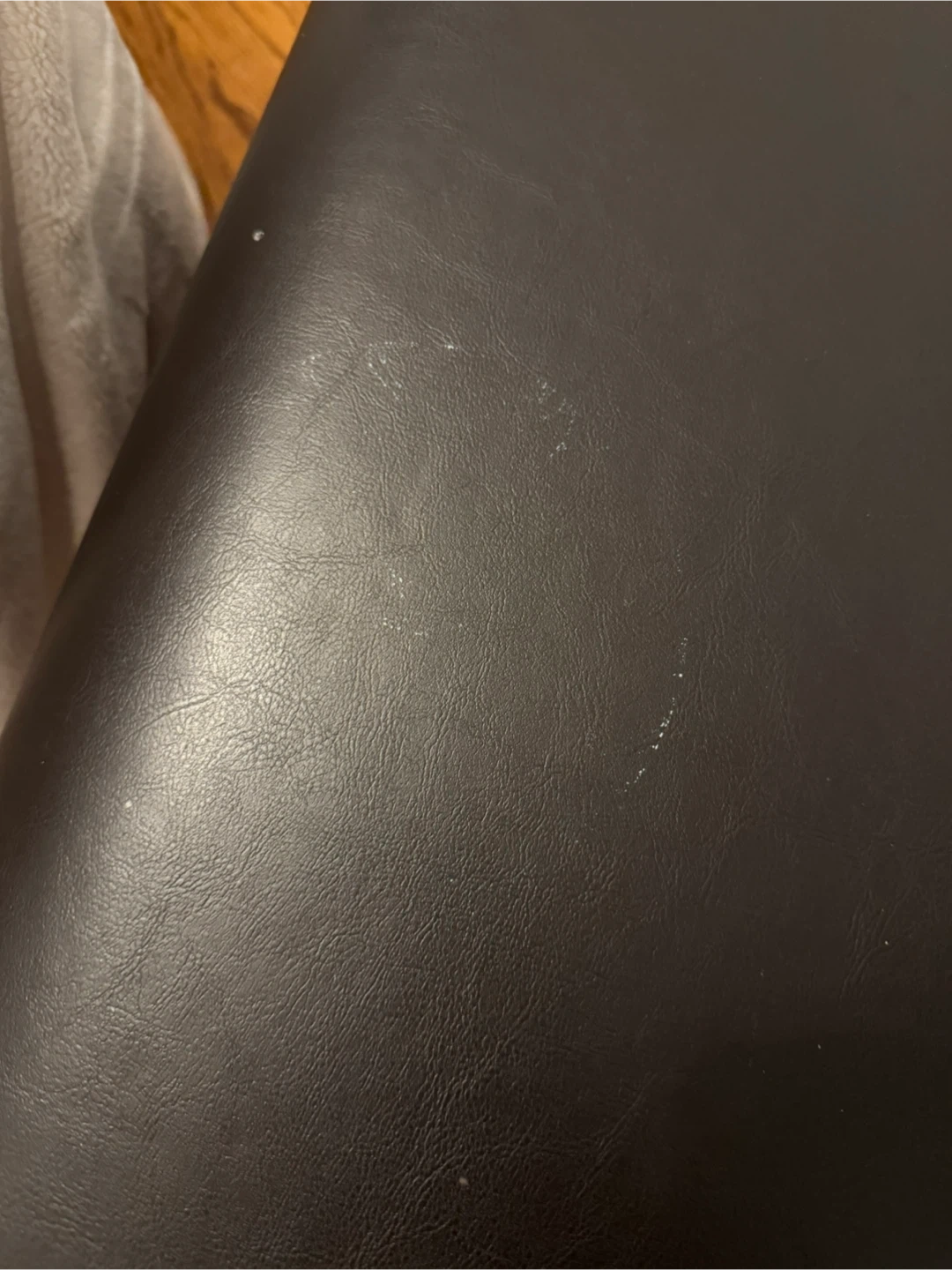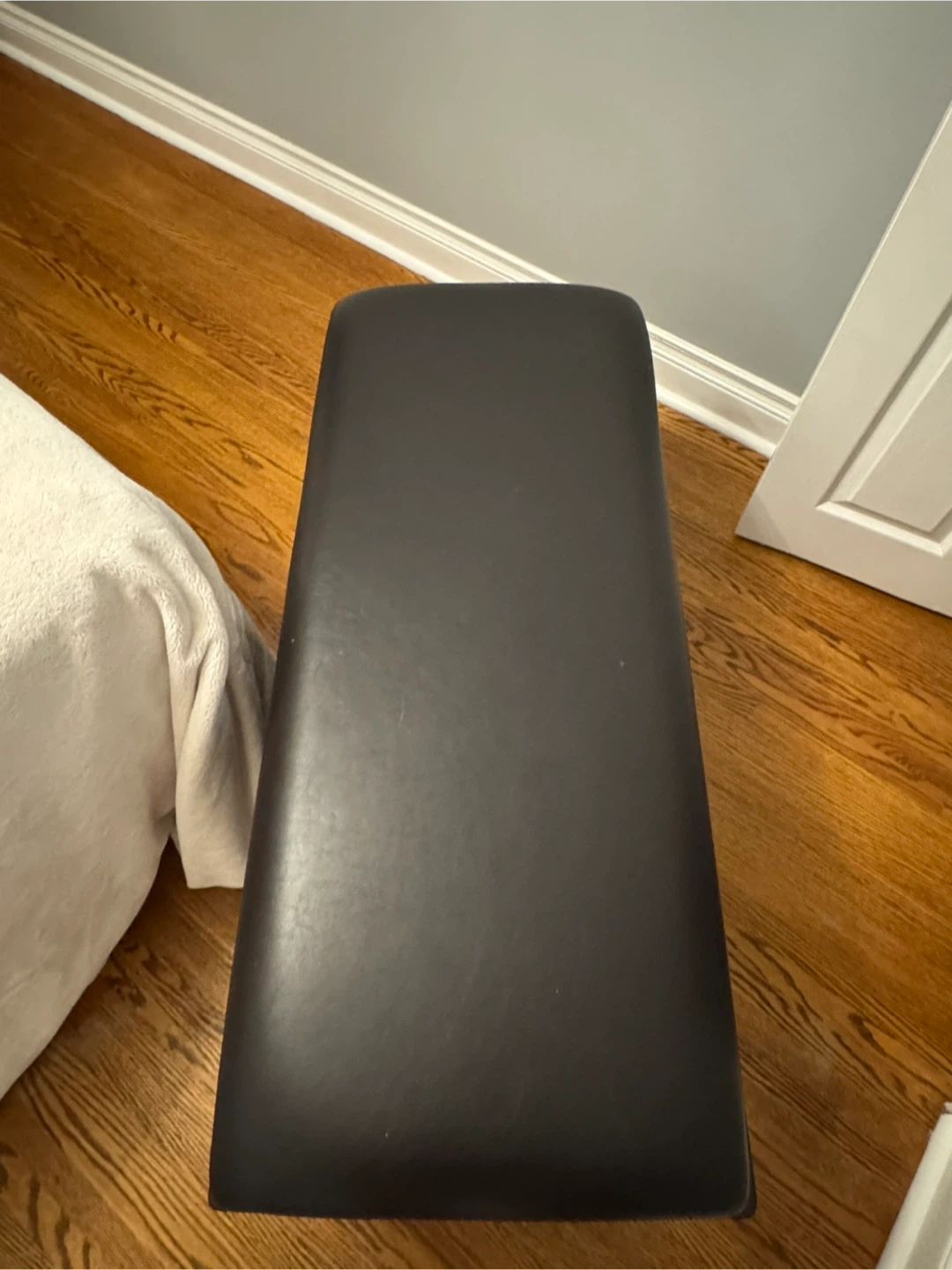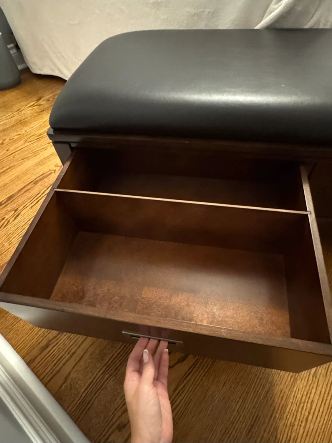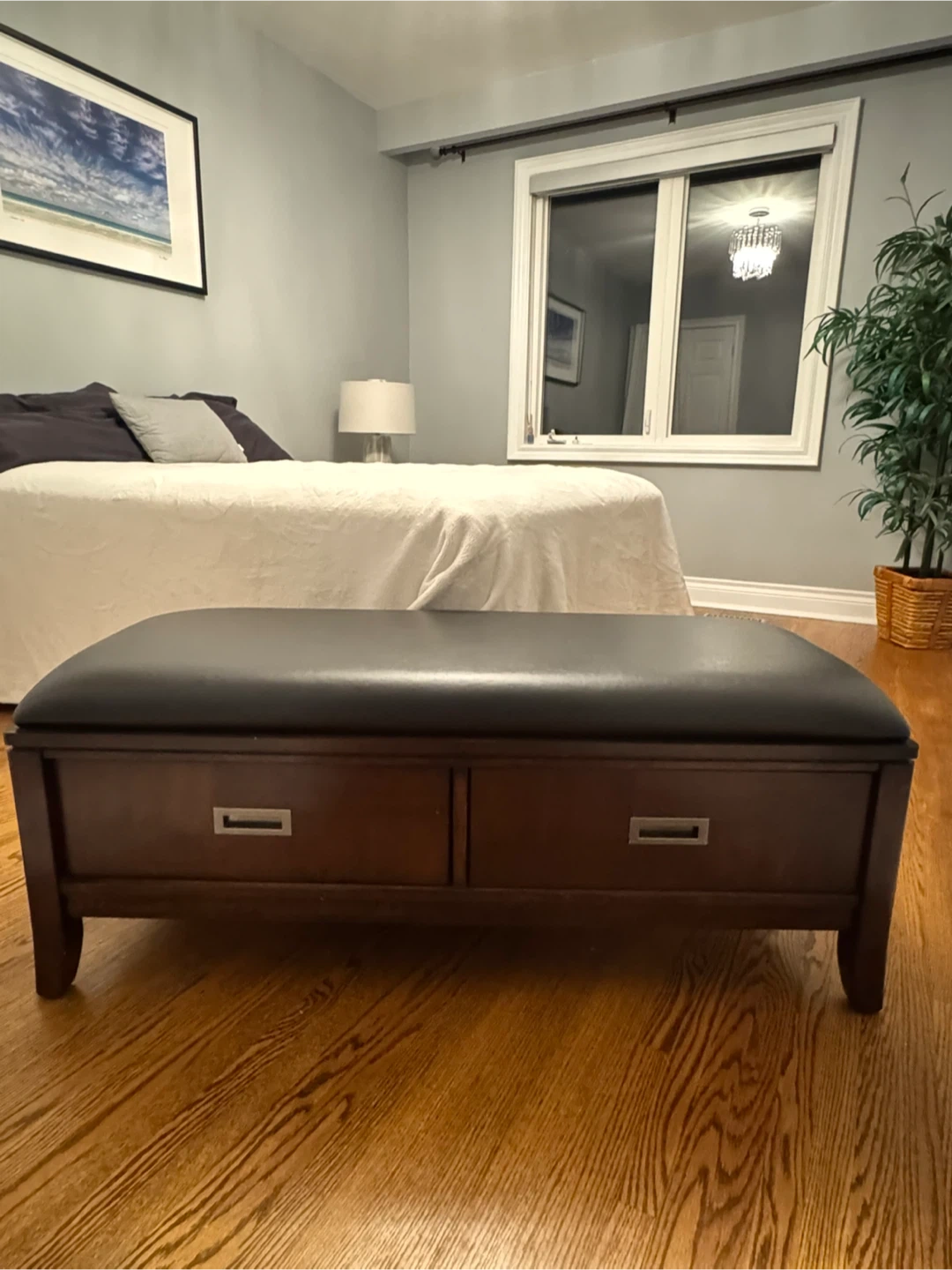 Selling a storage bench with a dark brown wood frame and a black faux leather top. It features two drawers for convenient storage. There are some minor signs of wear on the faux leather, but overall it's in good condition! Measurements: 47.5 inch length 20.5 inch wide 18 inch tall
