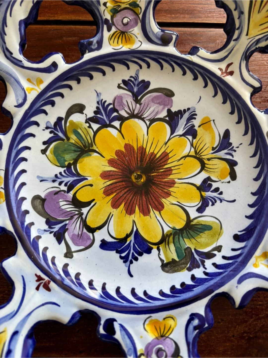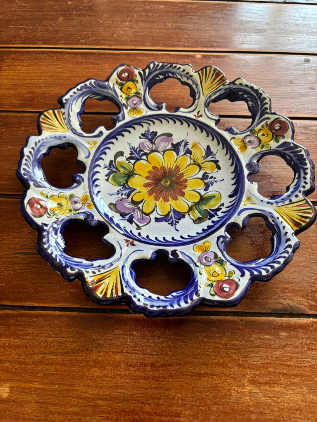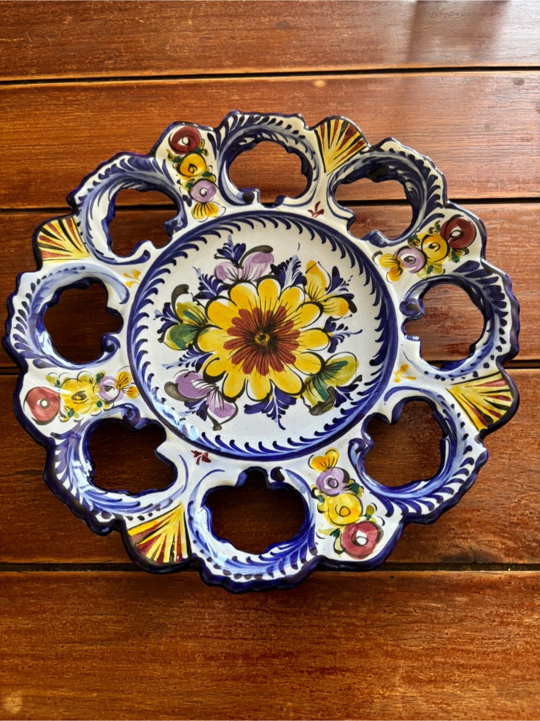 Beautiful decorative plate with a vibrant floral design. The plate features a central yellow flower surrounded by colourful accents and a unique cut-out edge. Hand painted in Portugal. Perfect for adding a touch of charm to any room! 11” wide. Cash only.