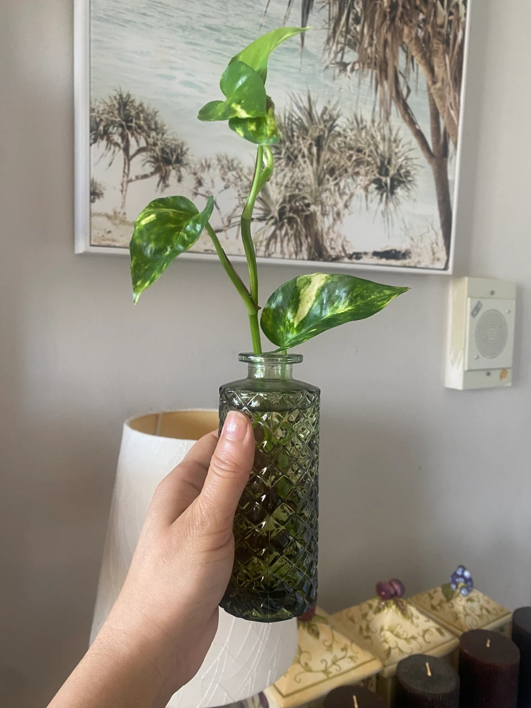 A cute green glass vase with a plant cutting inside. Perfect for adding a touch of greenery to your space! The vase has a textured pattern and a unique vintage look