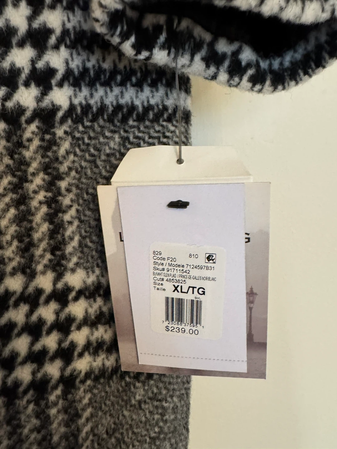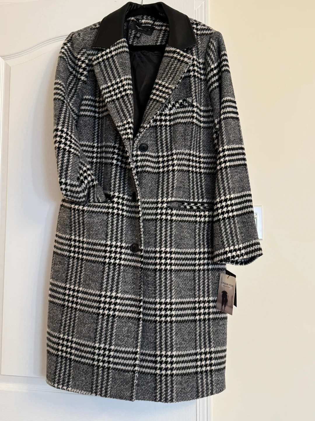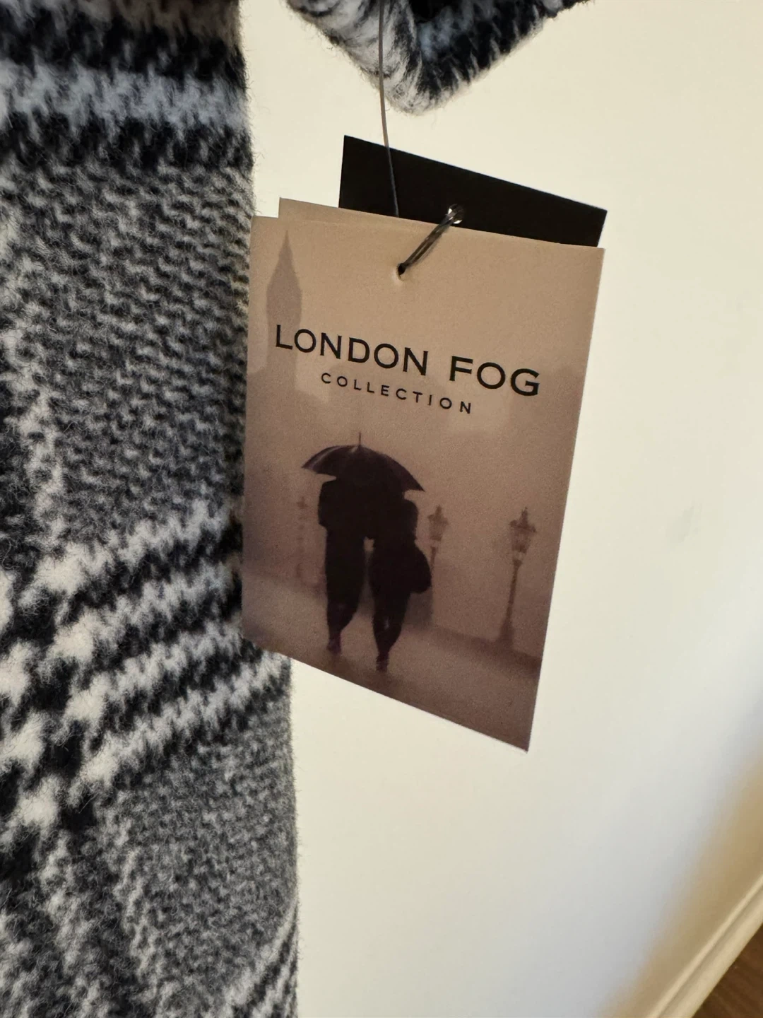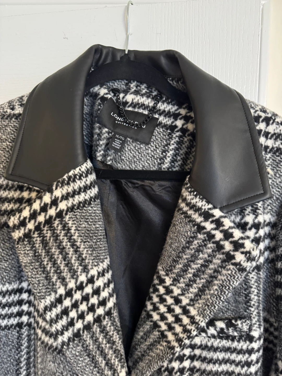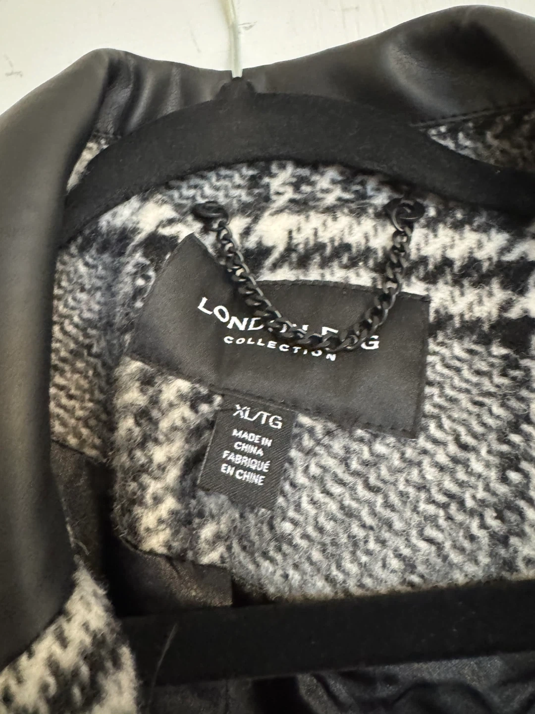 London Fog Collection coat in XL/TG size! This stylish coat features a classic black and white plaid pattern with a black faux leather collar. It's made in China and ready to keep you warm and fashionable
