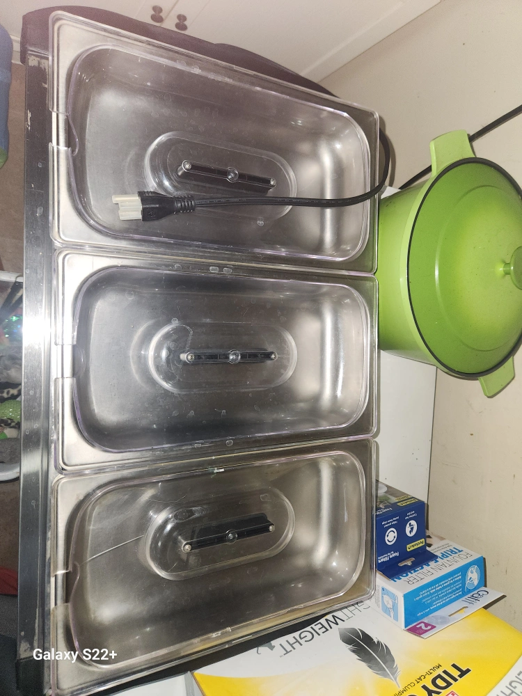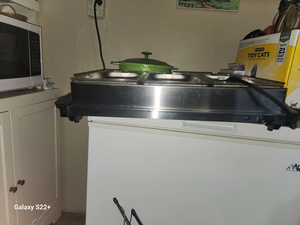 Chef brand triple food warmer, perfect for keeping dishes warm at parties or gatherings! It has three separate compartments, each with its own lid. Great for buffet-style serving! One lid has slight crack in it but does not effect it at all.