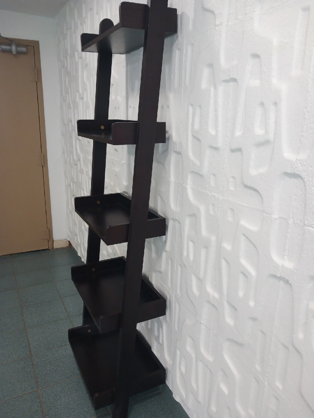 Selling a dark brown leaning ladder shelf. It's in great condition and perfect for adding some vertical storage to any room. The shelf has a simple, modern design that fits well with a variety of decor styles. It's a great way to display books, plants, or other decorative items