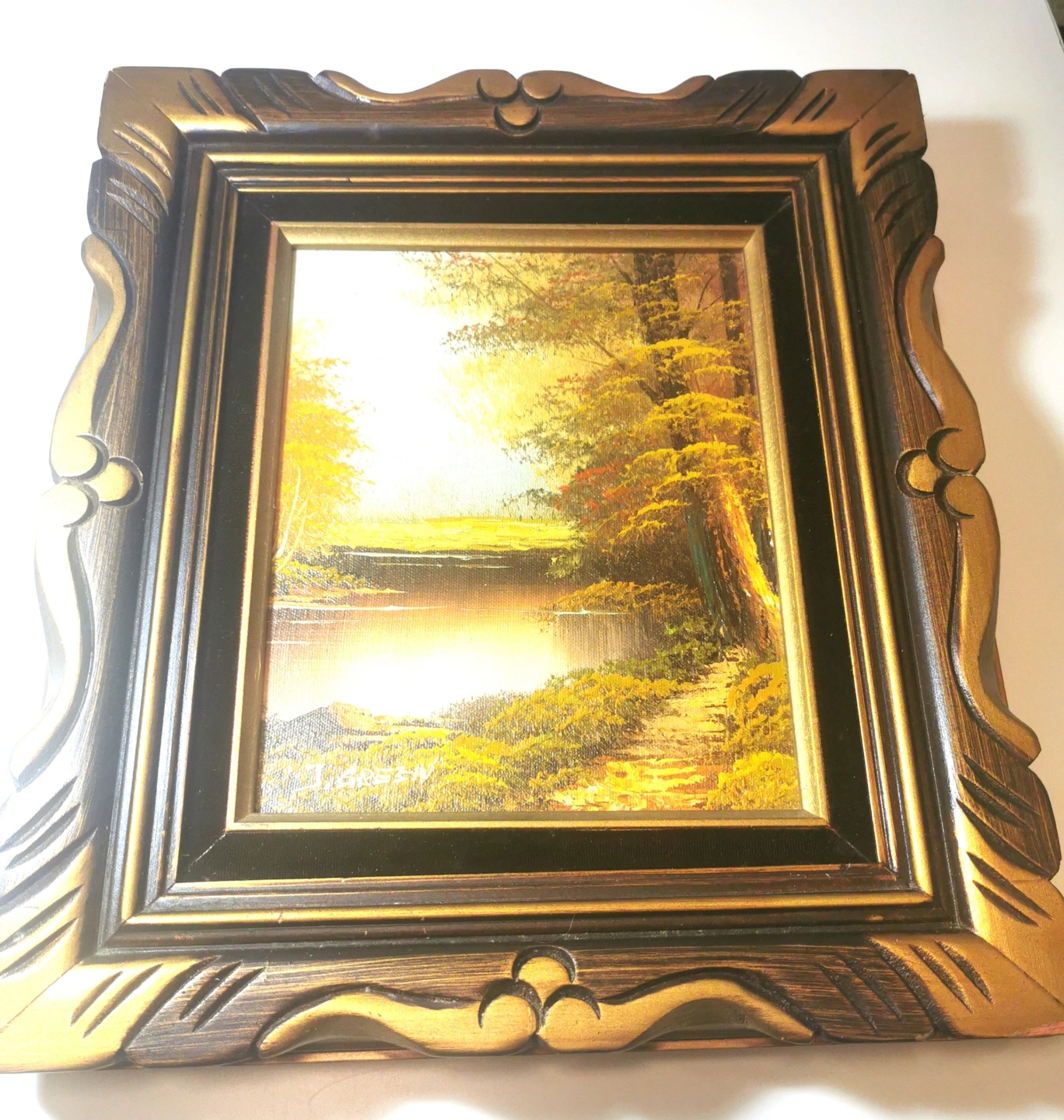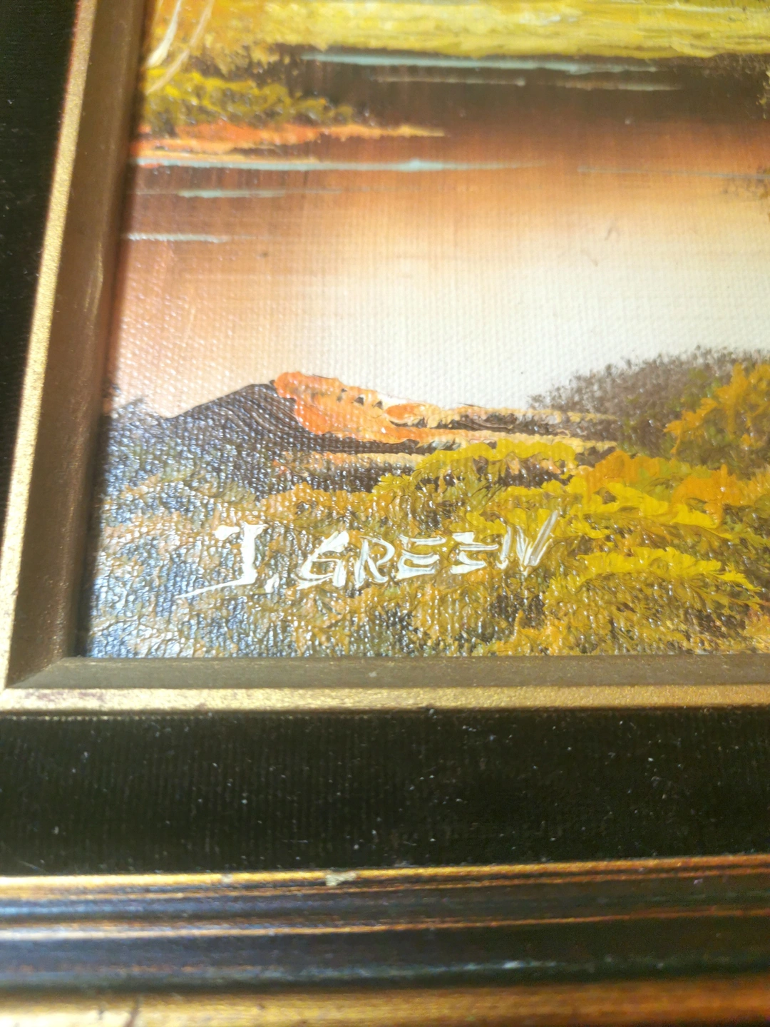 This vintage 1950s oil painting by artist J. Green depicts a landscape scene in nature. The painting is framed with a guilded wood frame and black velvet trim, adding a touch of elegance to the medium-sized canvas artwork. Measuring 15.5 inches in length and 13.5 inches in width, this framed painting captures the essence of the 1950s era with its timeless subject and production technique of oil painting. The unique combination of vintage style and natural theme makes this piece a standout in any art collection. NOTE: Excellent vintage condition light wear please reference photos as part of the description