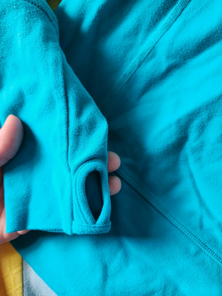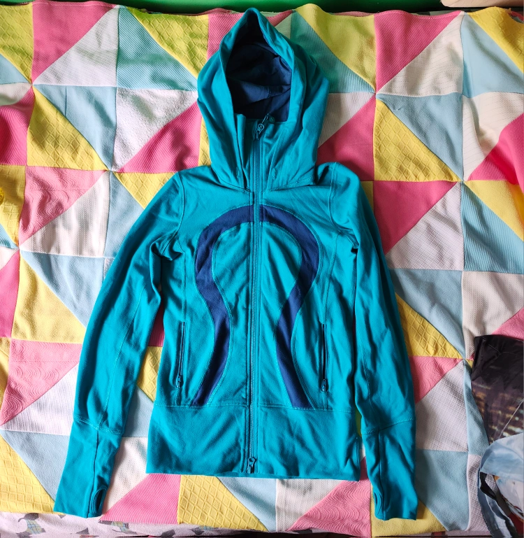 75super cute tight fighting lululemon hoodie/jacket. has an extra layer around the neck, thumb holes, and a double zipper. label size has been removed, please use the measurements - pit to pit laying flat is 16.5in, length from shoulder to bottom is about 24in item is in great used condition with no flaws or stains that I could notice.
