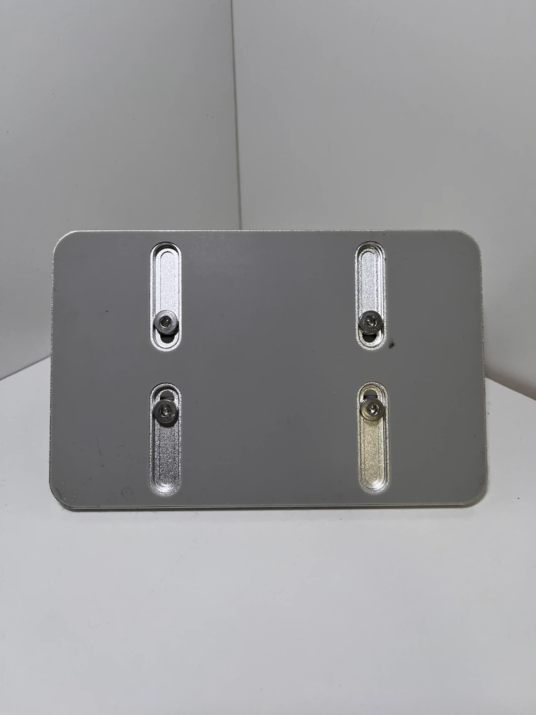 It's made of aluminum and is a sleek silver colour. Adjustable width and slot for one laptop.